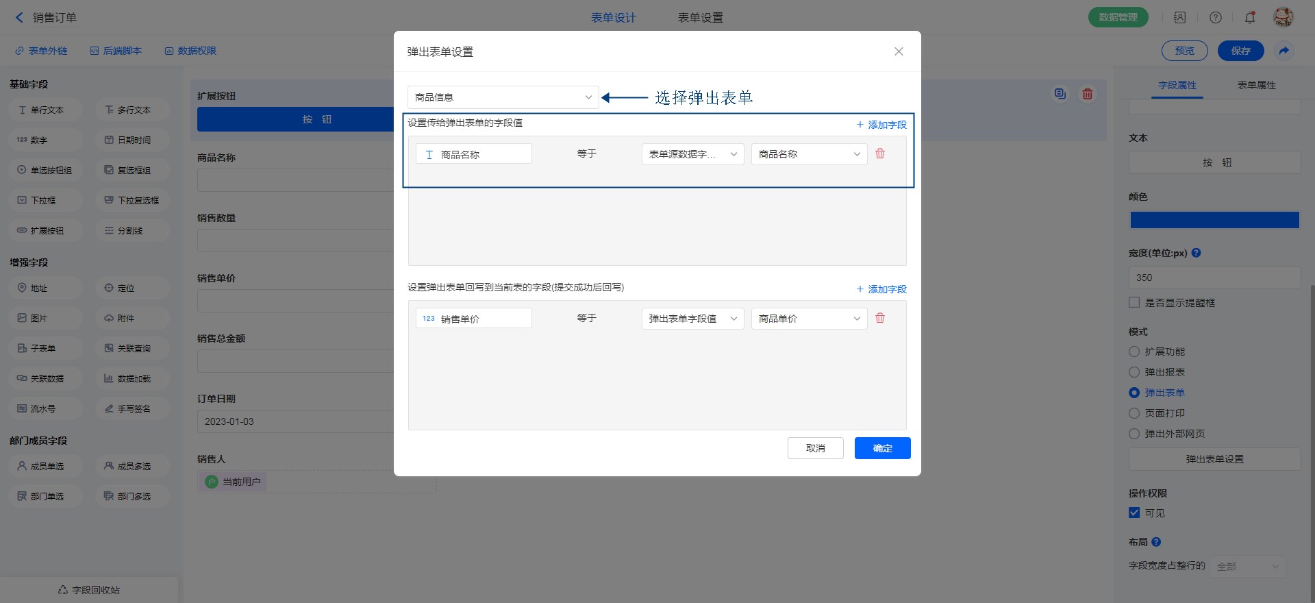 当前表单提交或编辑数据时,点击按钮,弹出表单,当前表单的字段值会自动回写到弹出表单对应的字段中。