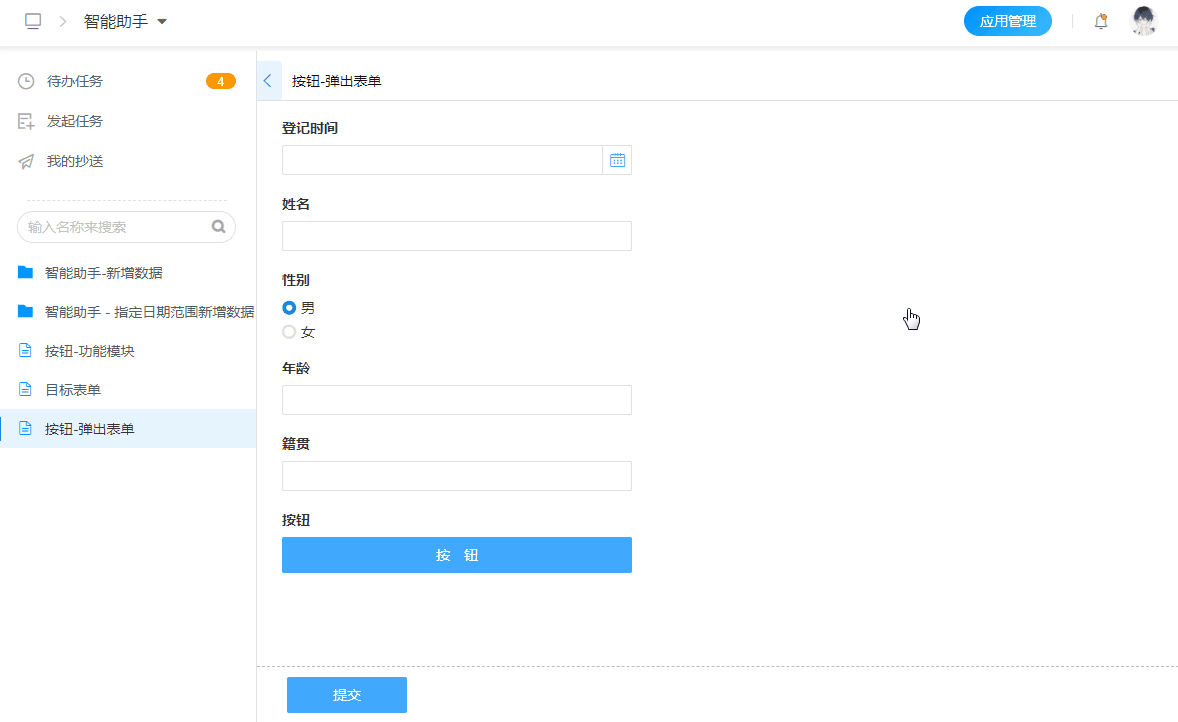 弹出表单是扩展按钮的最基本功能之一,设置扩展按钮的属性为弹出表单后,在用户点击扩展按钮时,会自动弹出指定的表单,并可根据需要,将当前页面的内容传递到被打开的页面中,在提交数据后,还可将指定内容返回到当前页面。