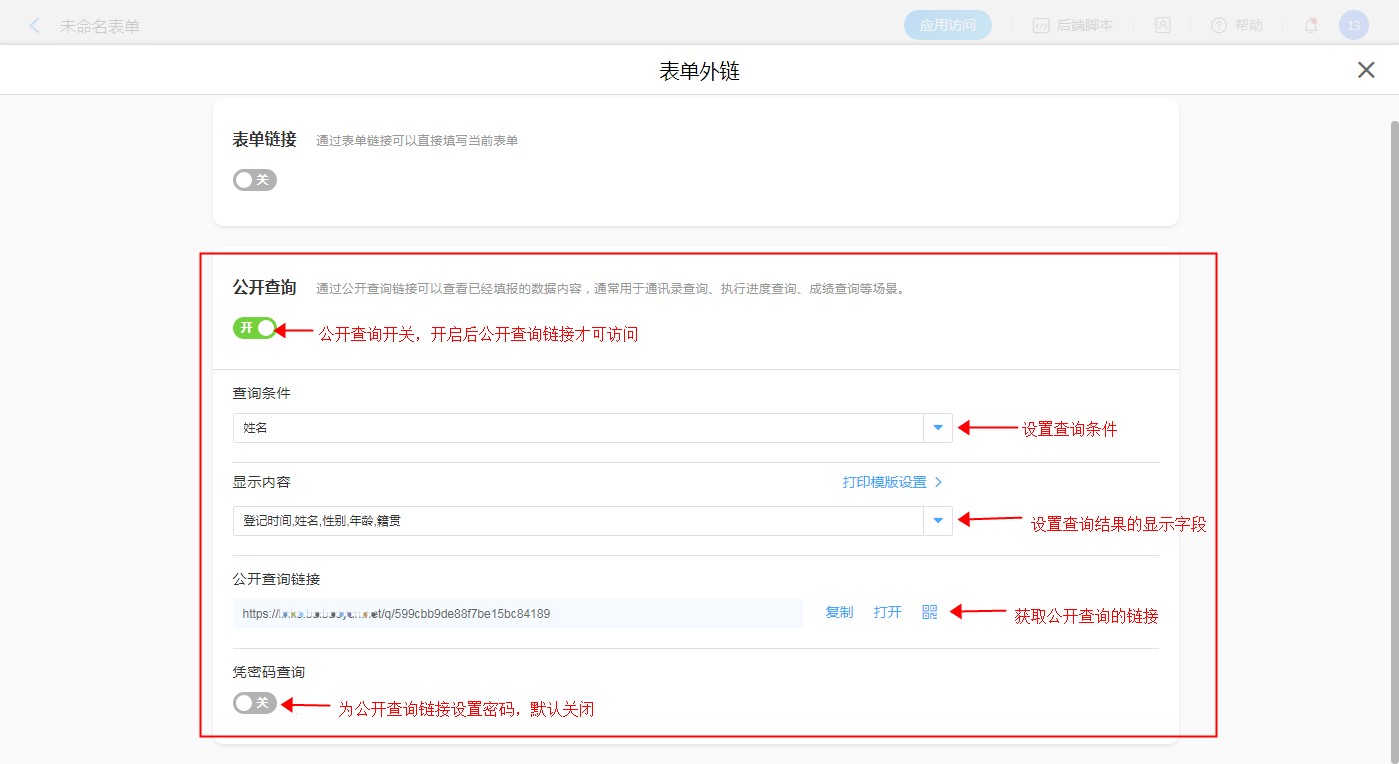 操作步骤:表单“编辑页面” > “表单外链”处开启公开查询,并设置查询条件与显示内容。