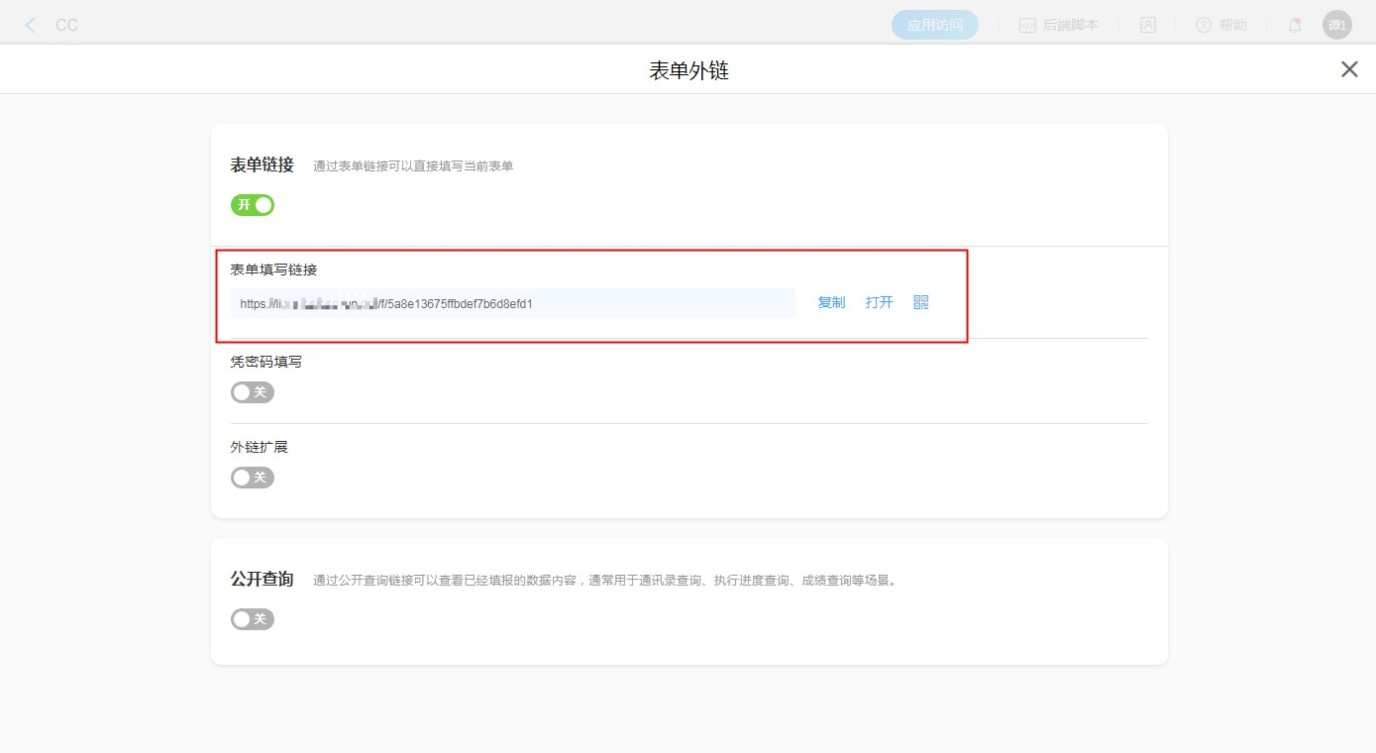 操作步骤:表单编辑页面 > 表单外链 > 开启“表单链接”开关