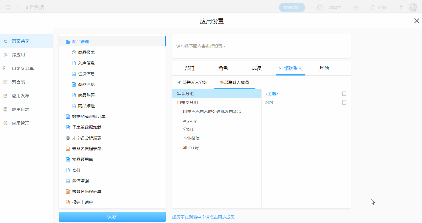 操作步骤:点击“设置” > 页面共享 > 选择任意一个表单或报表 > 勾选被共享的成员账号。