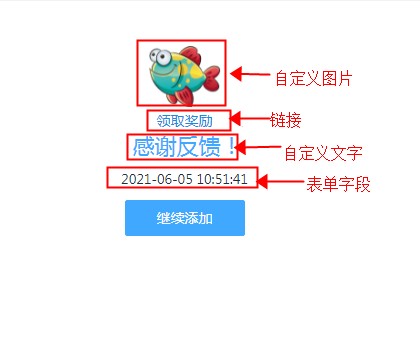 表单的作用可以根据场景的变化而变化,可以是问卷调查、故障报修、自助下单等多种业务场景,但提交后显示的都是“提交成功”->“继续添加”。