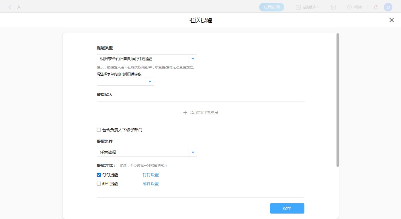 注意:如果是根据日期字段到期提醒,一定要将被提醒人加入「数据协作权限组」,拥有查看的权限。因为成员收到提醒时,可点击链接直接进入表单的协作界面,所以至少要在一个权限组内。