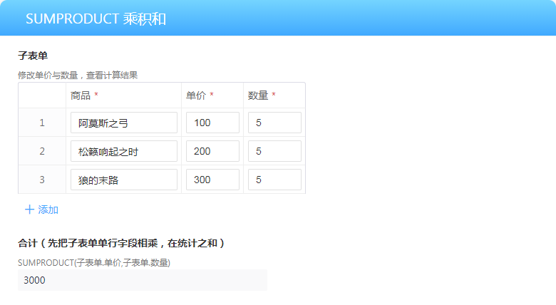 专门用于子表单内的多行数据计算,先计算每一行数据的乘积,最后再求和。