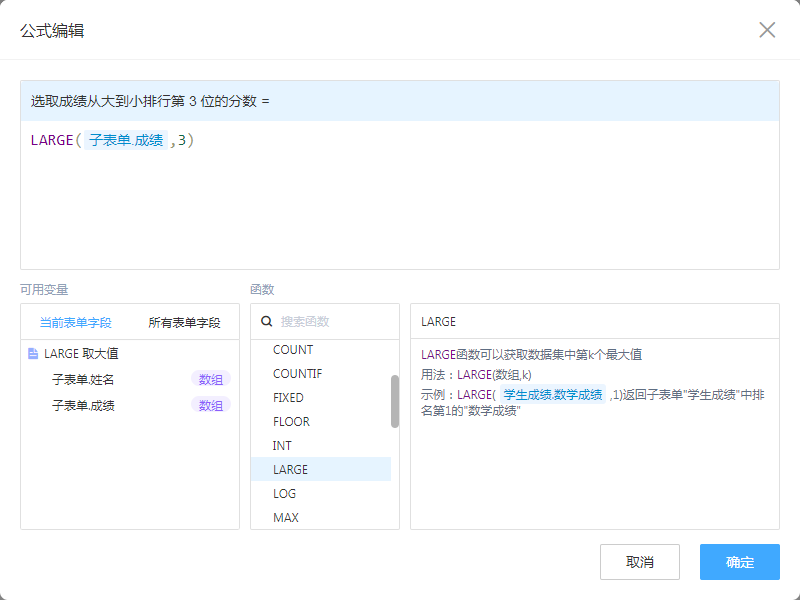 k 数字字段、整型 返回数组中从大到小排行第 k 位的数值