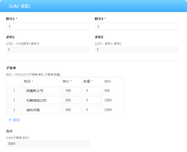 ②、在子表单里,统计总数、总价格时,就只能使用“SUM”函数。