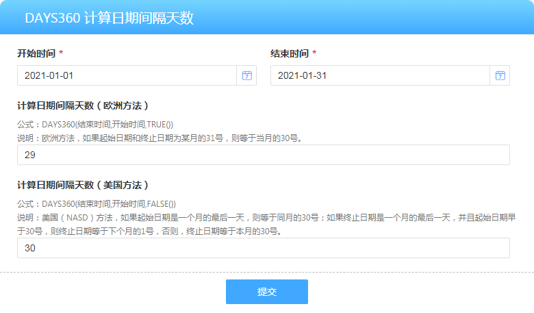 | method | 逻辑型 | 默认不填为FALSE()表示使用美国方法计算 TRUE()表示使用欧洲方法计算 |