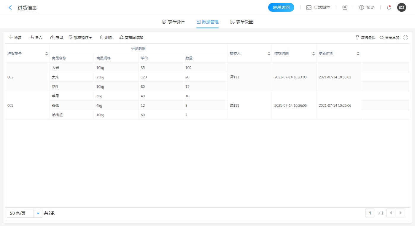 • 如果添加字段的对应关系为当前表子表单字段对应数据源表的子表单字段,那么填充数据时,当前表子表单字段会以多行数据显示。