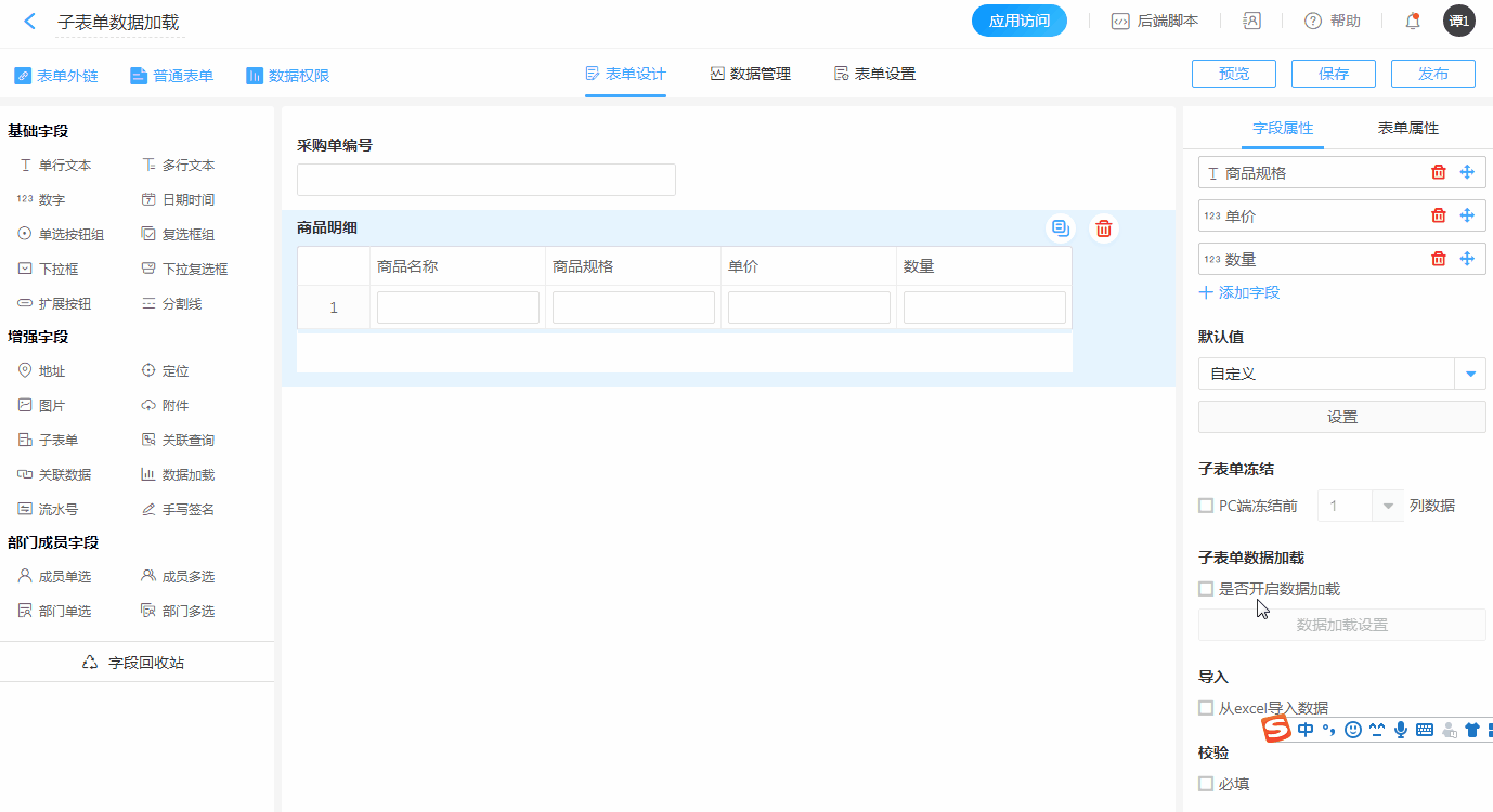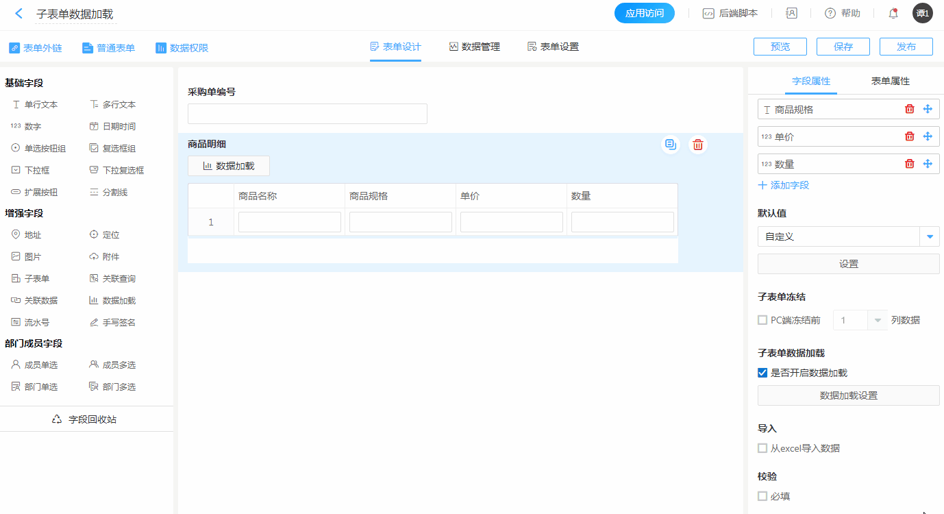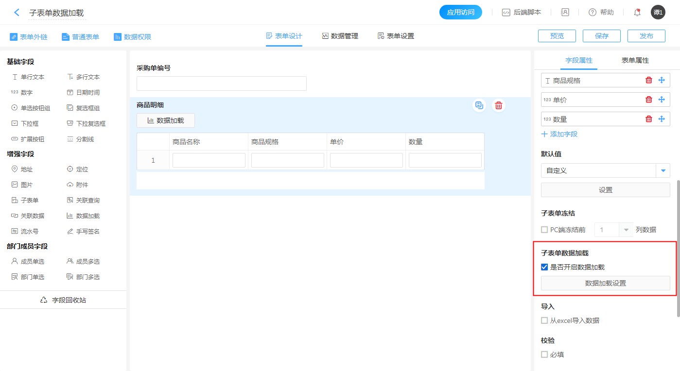 • 在【采购订单表单设计页面】——【子表单-采购明细】——【控件属性】——【勾选开启数据加载】——【在数据加载面板进行具体设置】