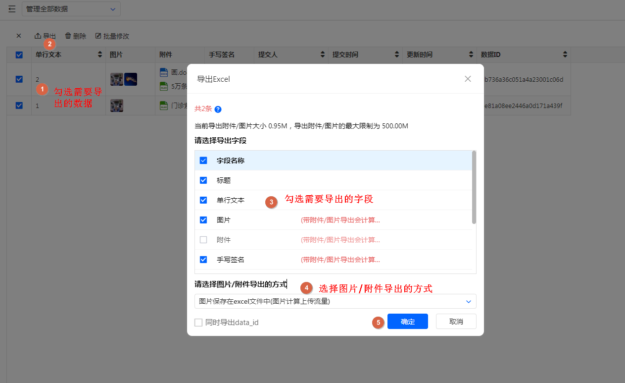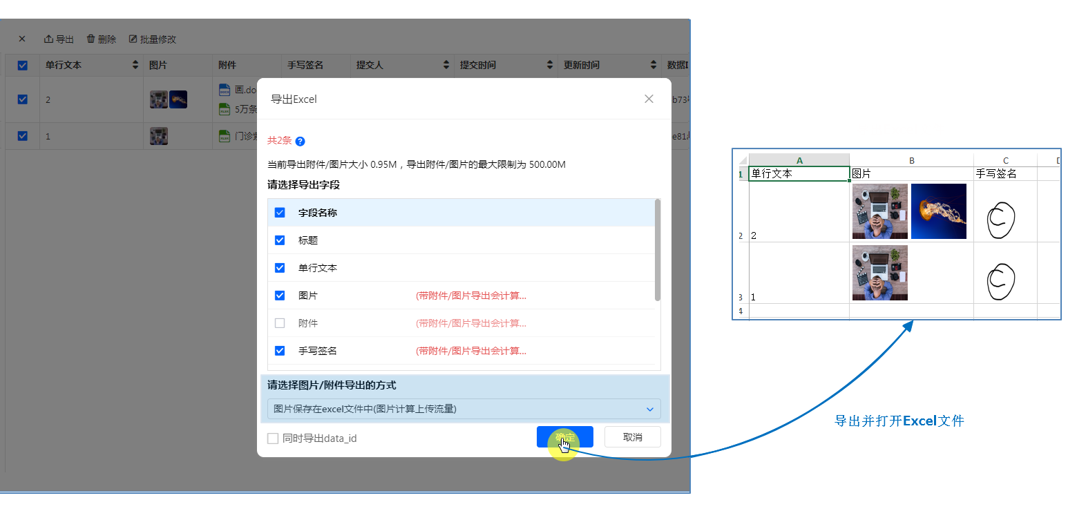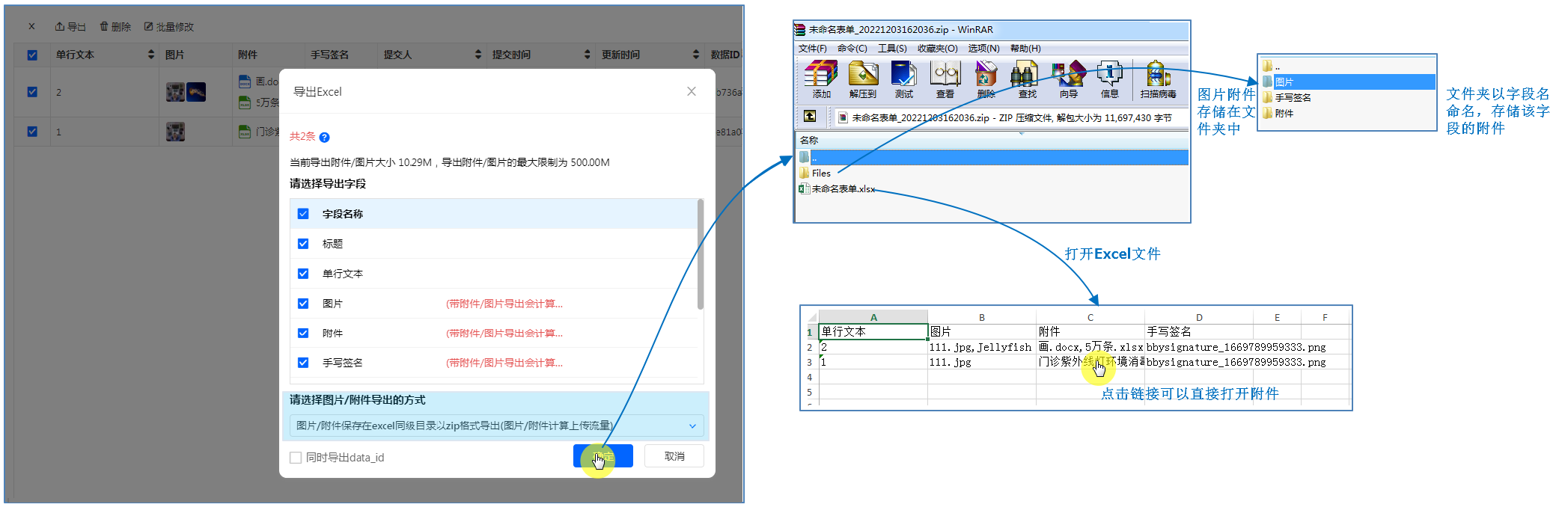 • 如果导出字段勾选了图片附件类型字段,则需要选择【图片/附件导出的方式】再执行导出操作。