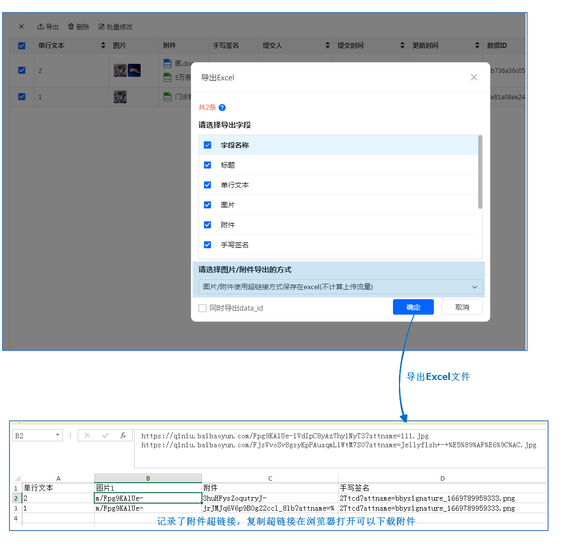 • 导出文件为Excel文件,如果勾选了导出图片/手写签名/附件字段,图片/手写签名/附件字段会以超链接方式保存在Excel中,用户可以使用超链接下载附件。