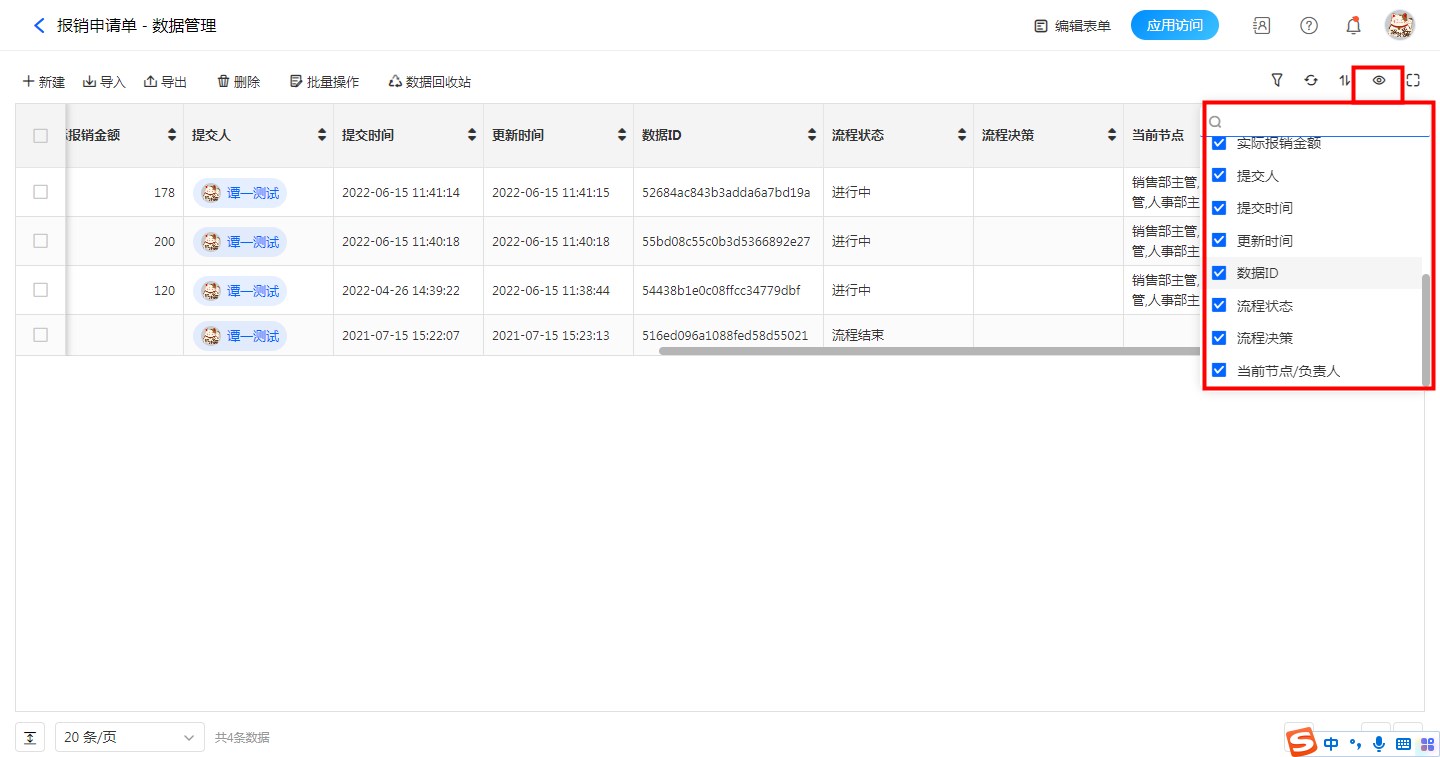 除了表单字段之外,显示内容中还包括【提交人】【提交时间】【更新时间】【数据ID】4个系统字段。