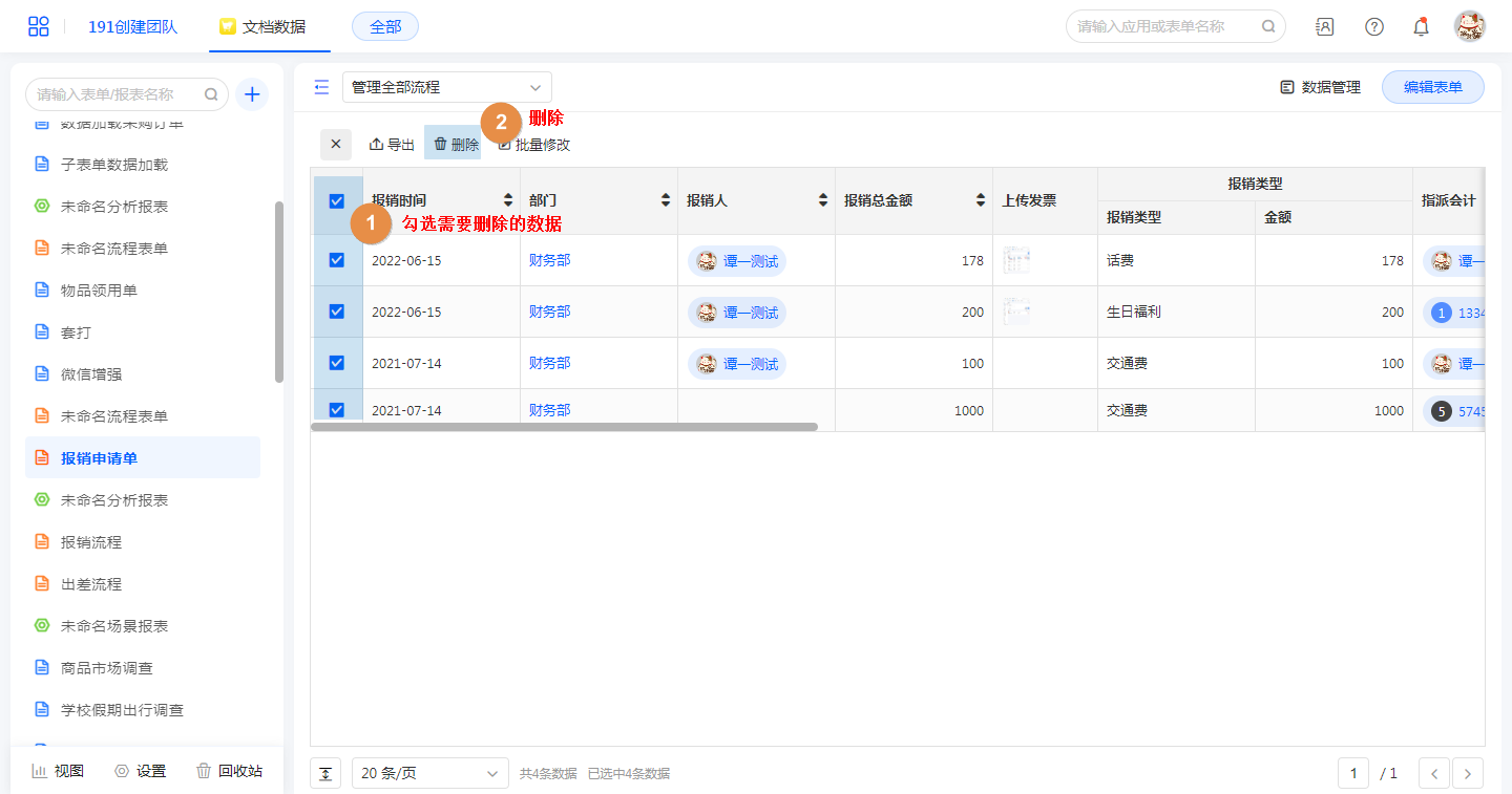 • 删除勾选数据:数据表格中勾选数据,点击删除