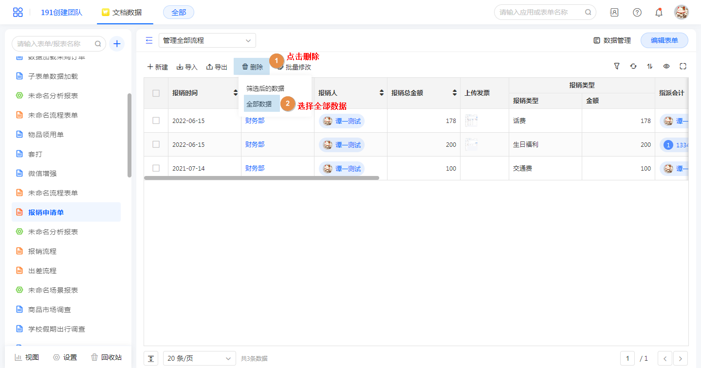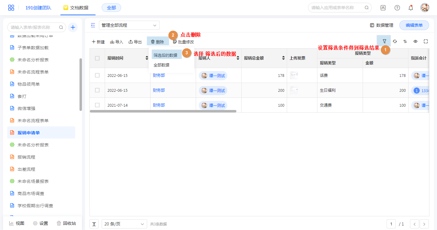 有3种删除数据的方式:删除勾选数据、删除筛选后的数据、删除全部数据
