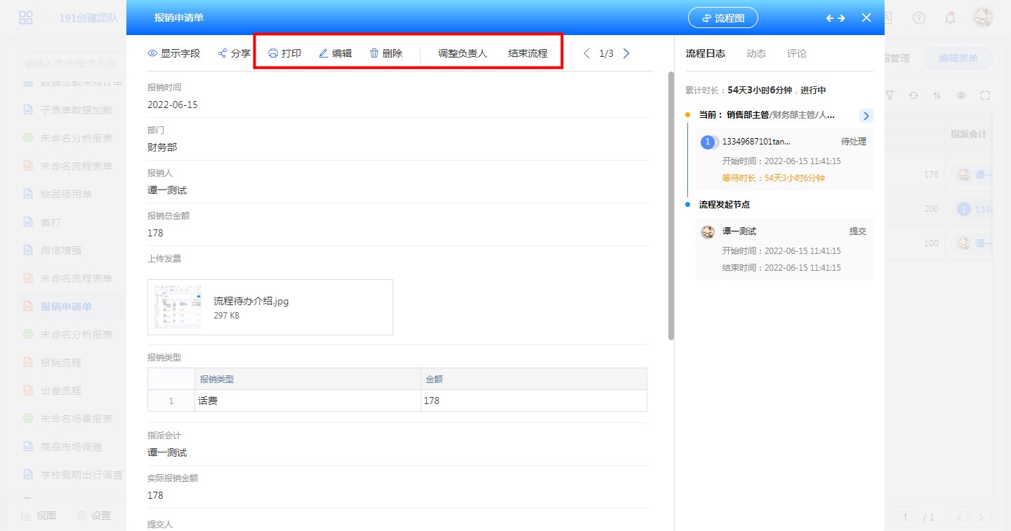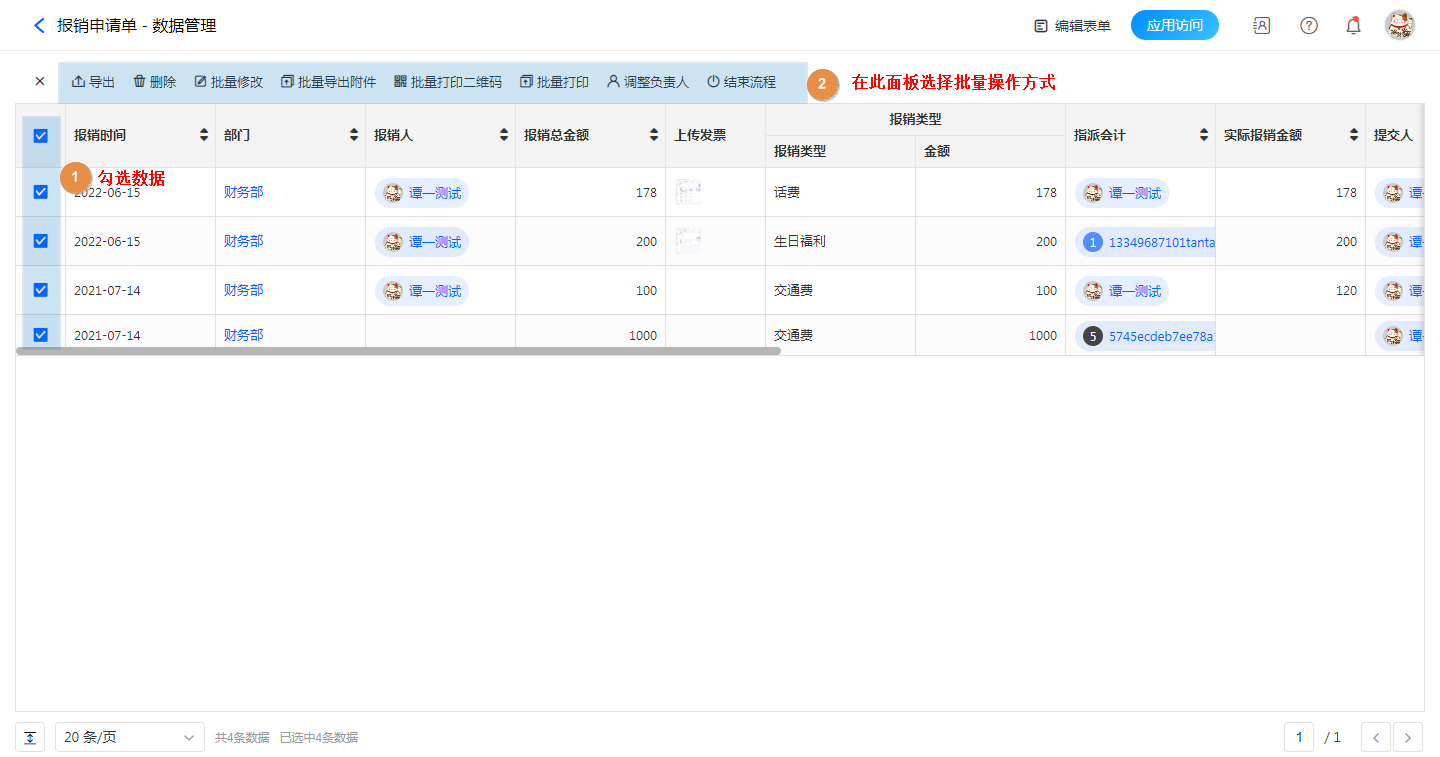 支持以下功能:批量修改、批量打印、批量导出附件、批量打印二维码、批量调整流程负责人、批量结束流程。