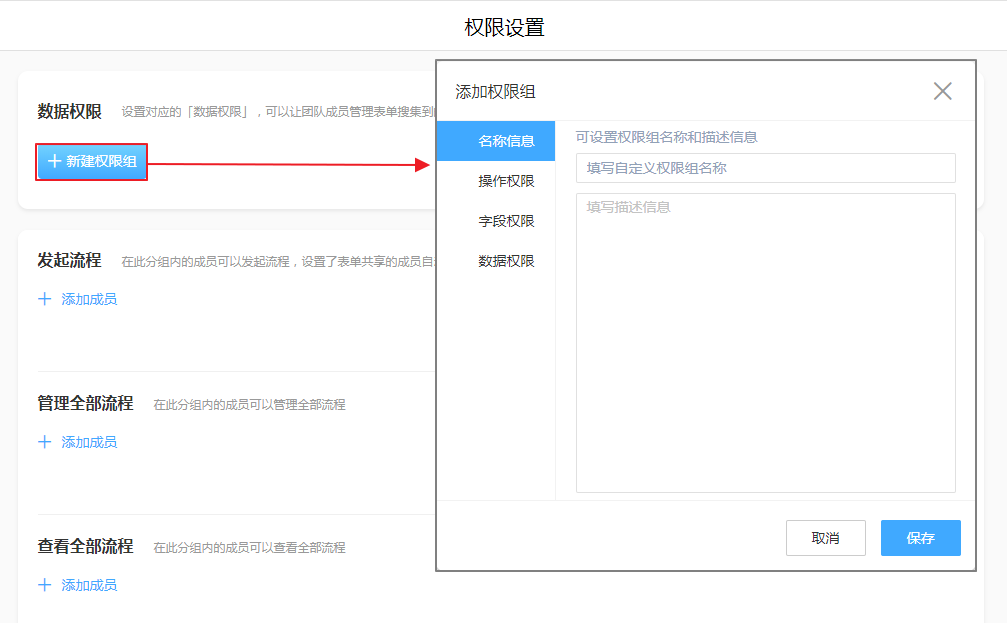 即给该权限组命名(权限组名称为必填)并可对该权限组进行简单描述(描述信息为选填)