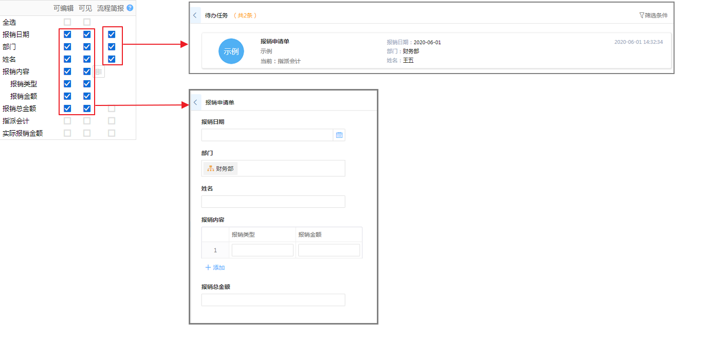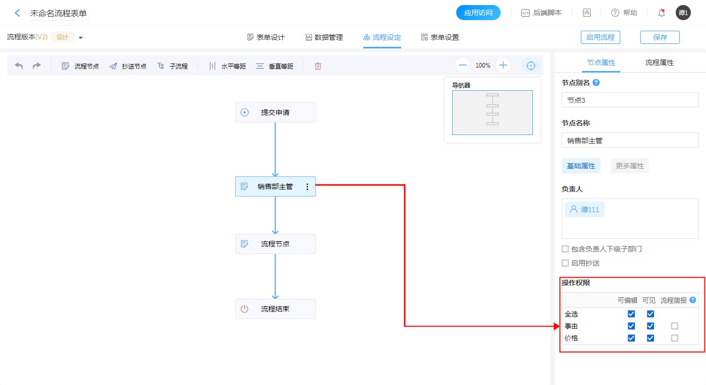 - 对该节点负责人在处理待办数据时的操作权限规定。决定了字段是否可见,是否可编辑,以及简报字段。