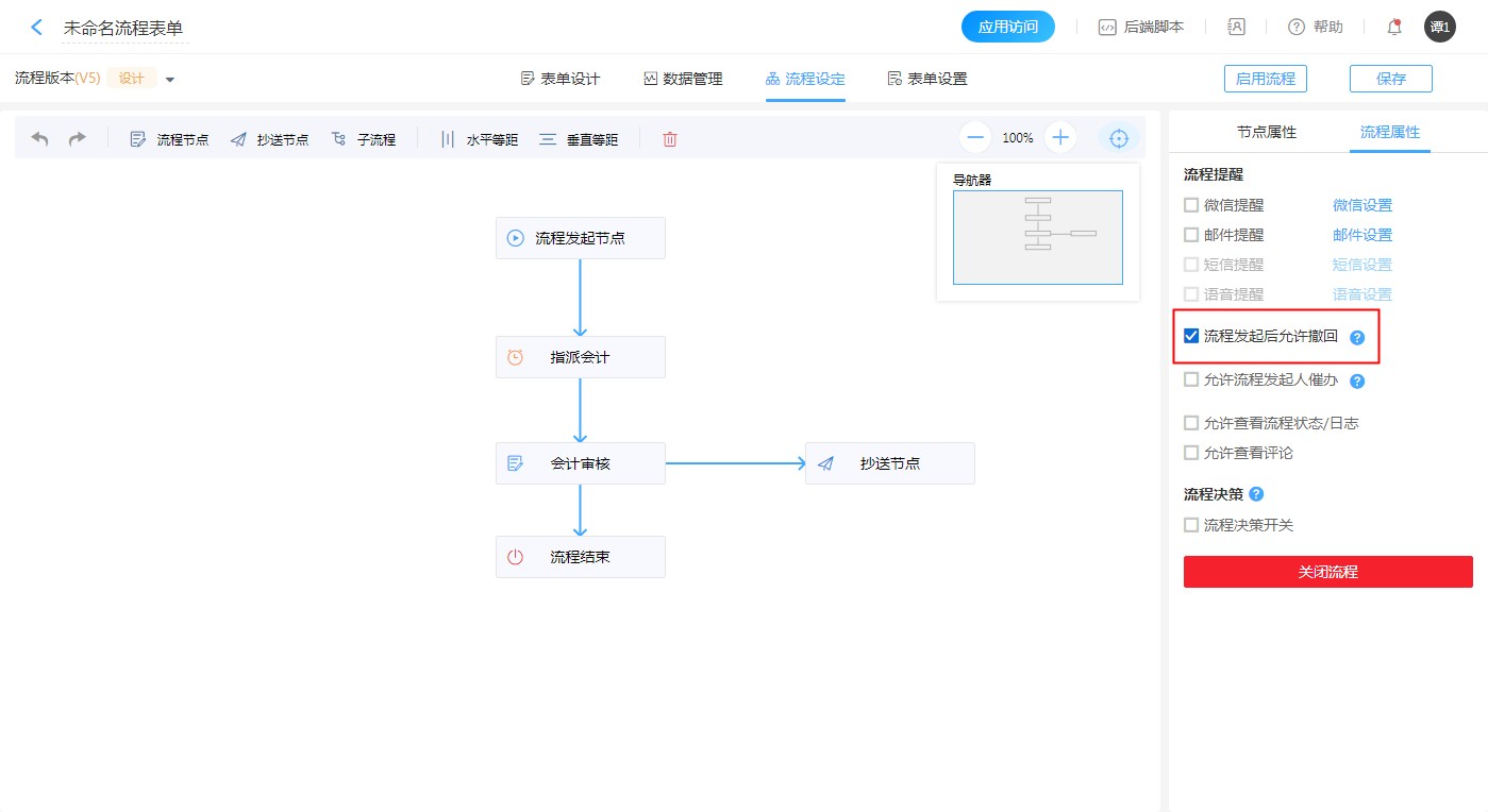 如果流程属性中勾选了「允许撤回」,在发起流程后,若下一节点未有人操作,在流程发起人的 对应应用访问页面->我发起的中找到并打开此条流程数据,可点击撤回;若下一节点已经对流程进行了操作,则撤回按钮不可见。