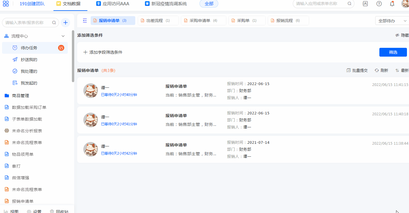 同样在【数据管理】,管理员也可查看数据的流程状态。(进行中、流程结束、手动结束等状态)
