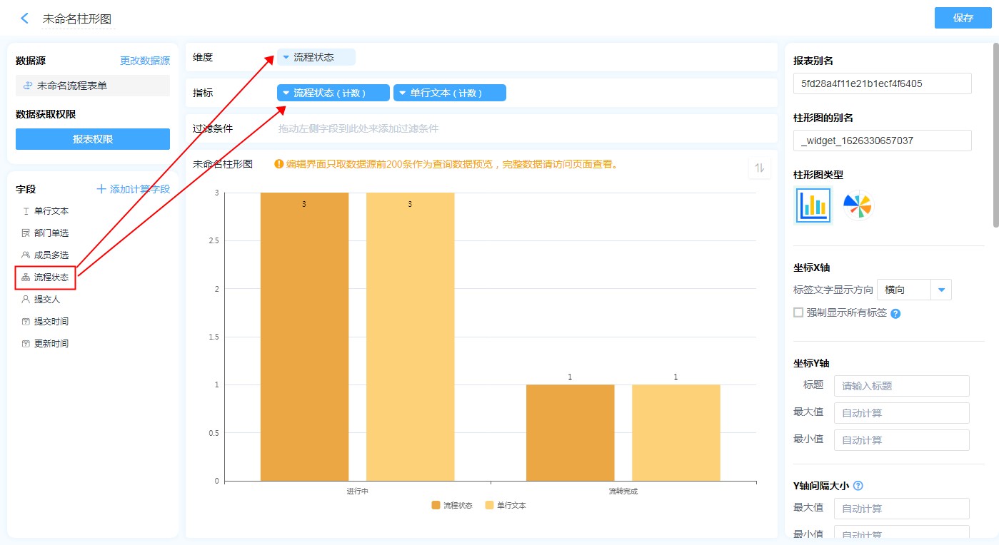 在流程属性中勾选了允许允许查看流程状态/日志,当在以当前流程表为数据来源的报表,可以添加【流程状态】这个字段在报表中展示。(报表中流程状态为进行中和流程结束)