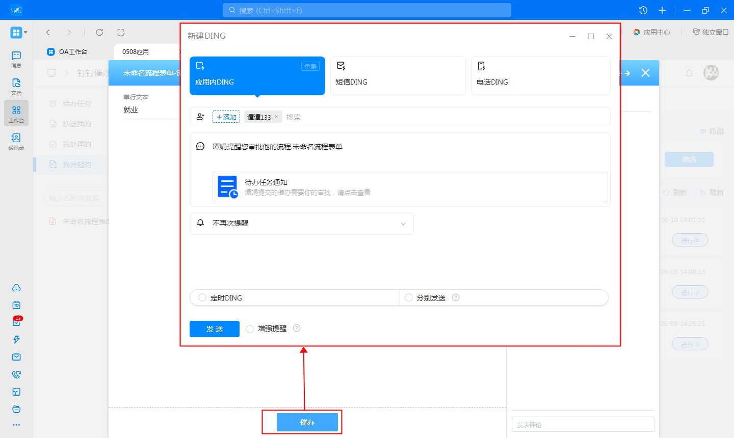 绑定钉钉的用户除了通过浏览器访问系统后台进行催办,还可以从PC/手机工作台处发起催办。