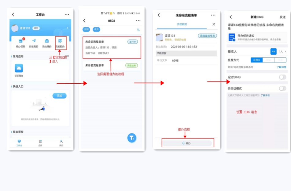 设置了以后,流程发起人即可在访问应用时在「我发起的」流程里找到需要催办的流程进行催办提醒。