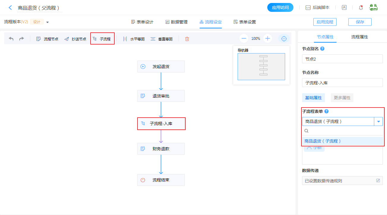 设置好父子流程的传递规则后,还可以设置子流程到父流程的传递规则。如产品入库后把是否入库及入库时间等数据再传递到父流程中,财务即可根据是否完成入库来进行退款操作。