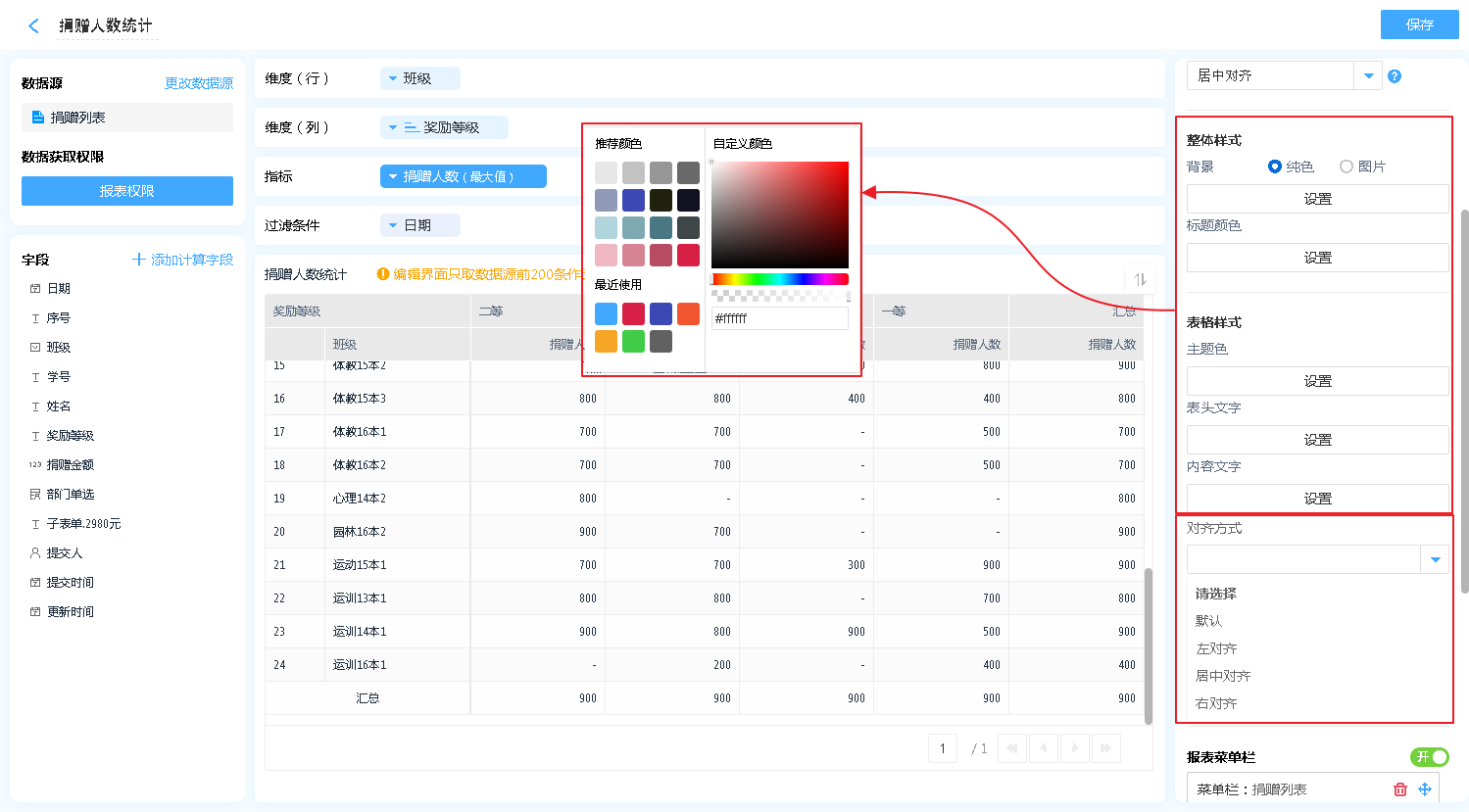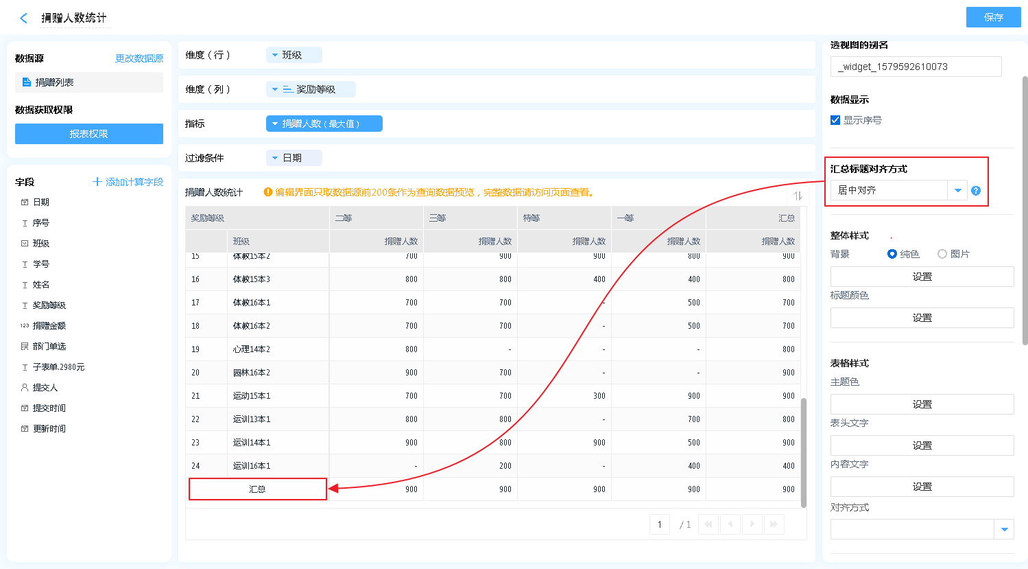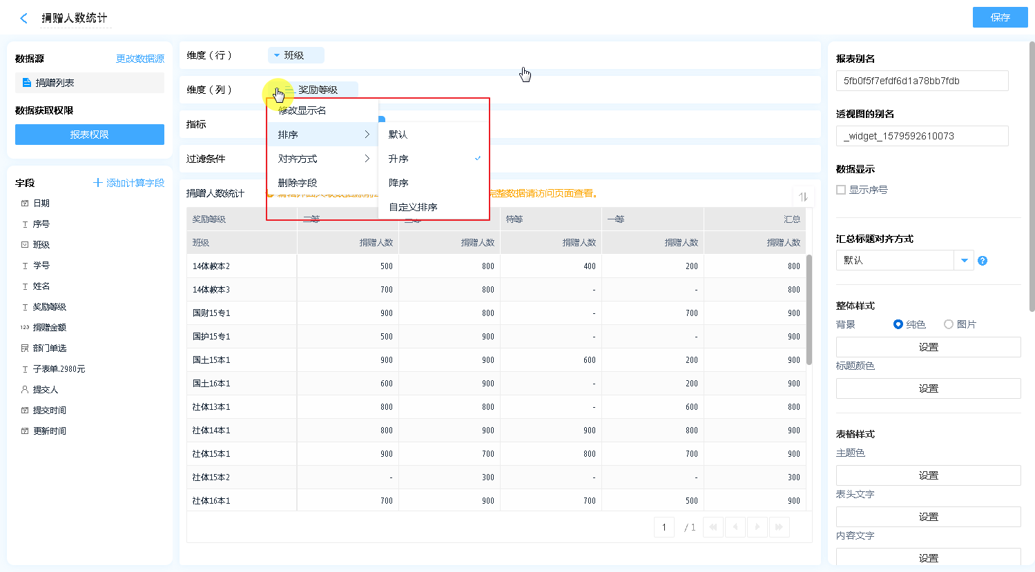 显示名称: 字段添加进入显示字段区域后,可自行修改其在数据表中的表头文字仅详情显示:选择后,当前字段在报表数据列表中隐藏,点击单条数据不受影响;反之亦然汇总方式: 仅日期时间字段可设置,可以设置按照何种日期格式对数据进行汇总(如:按年、按季度、按月汇总)排序:支持按照指定的格式对数据表内的数据进行排序[默认为数据创建时间]对齐方式:支持报表单元格文字的排列方式删除字段:此处的删除字段,是指从显示字段中删除,删除后仍可重新添加,不会对原表造成任何影响。