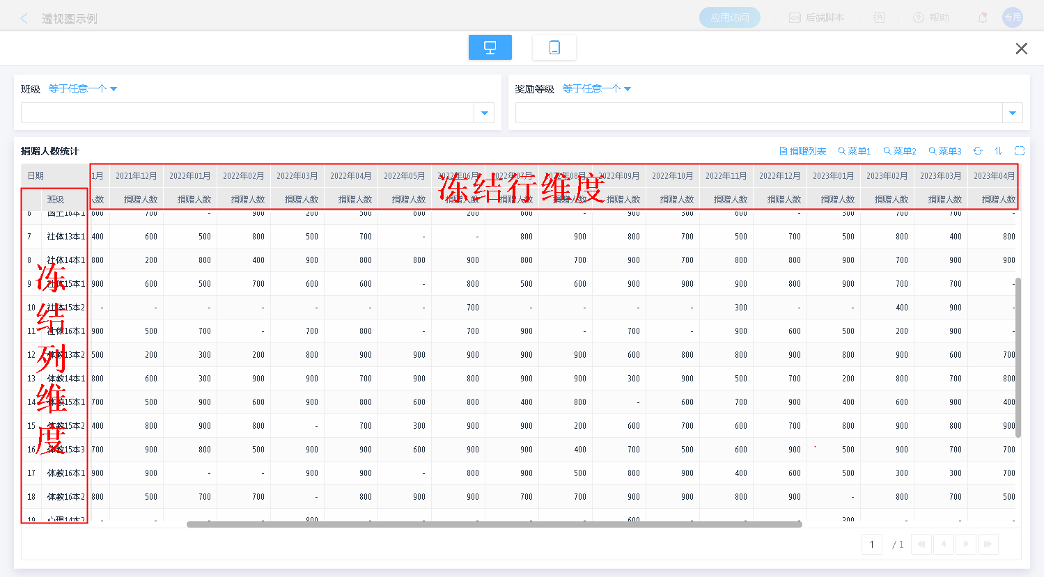 当汇总表数据量过多,在横向/纵向滚动时,可使用维度冻结功能,冻结汇总表的头部菜单。