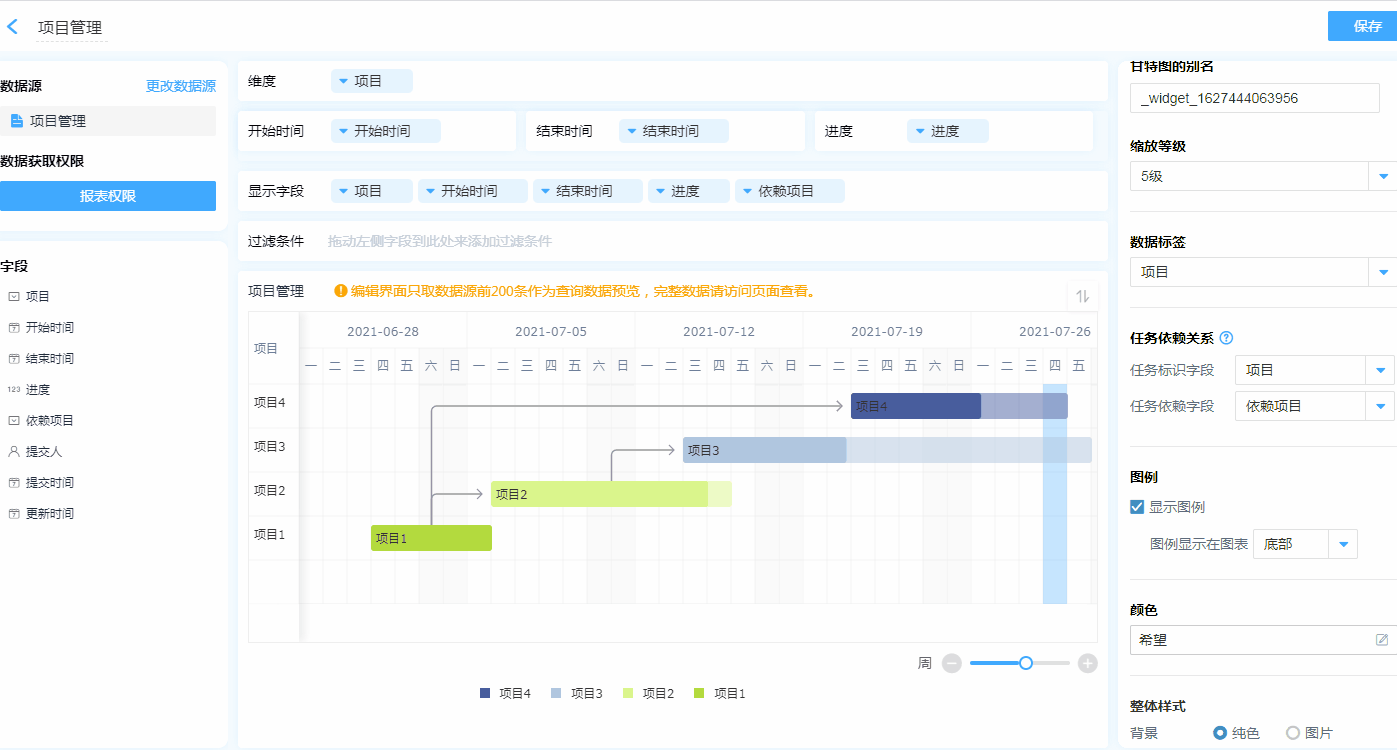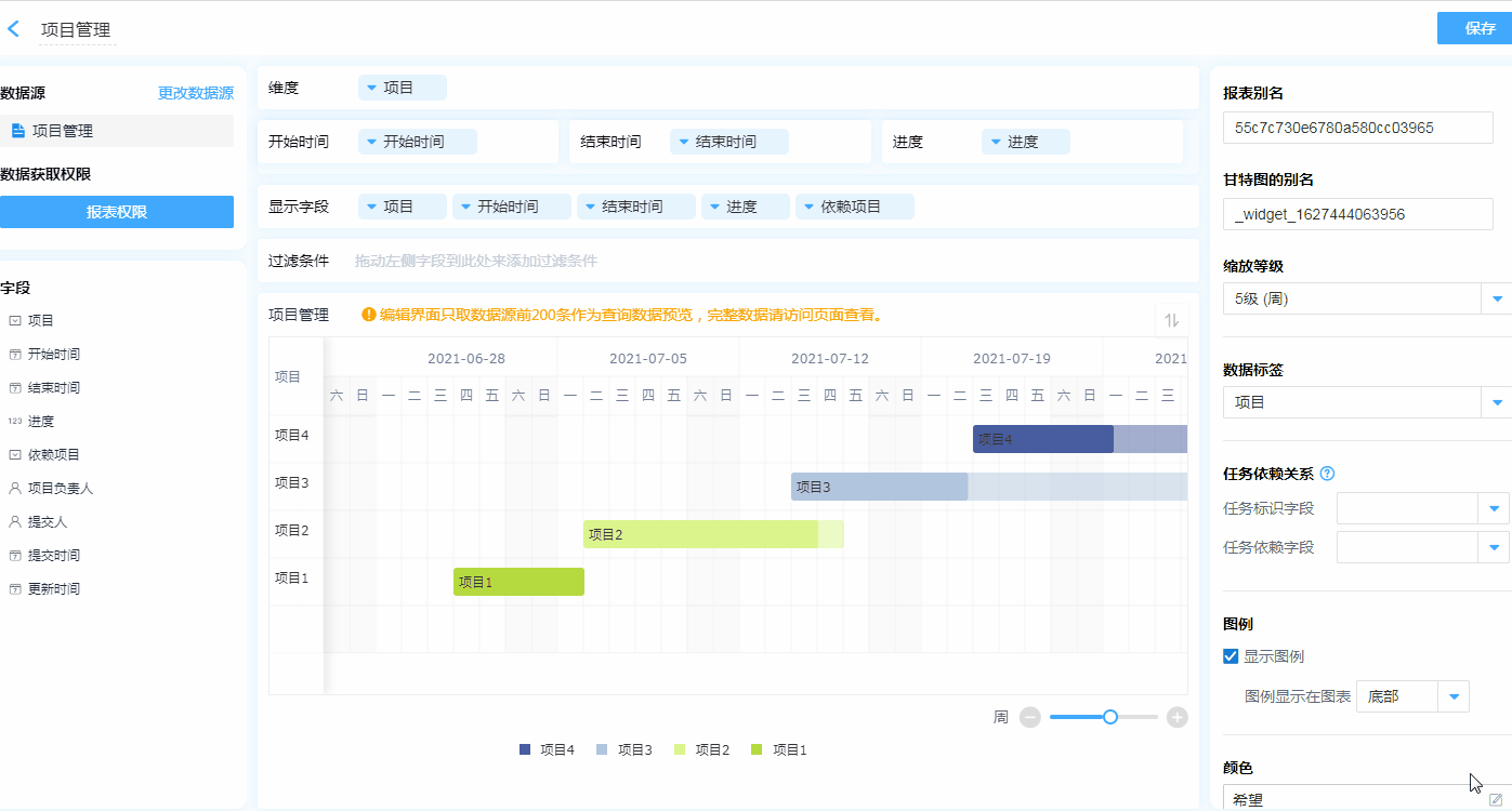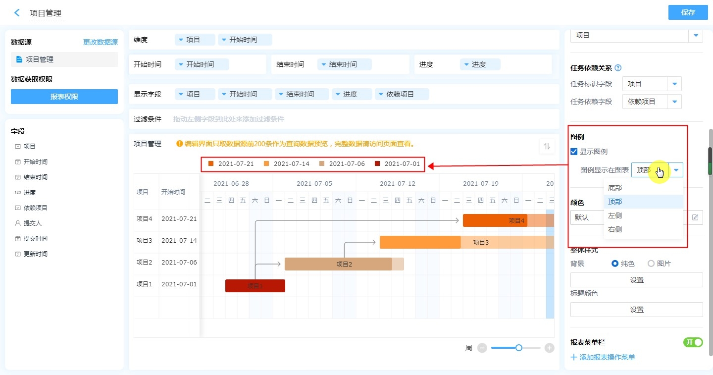 甘特图的设计区分为 维度、开始时间&结束时间、进度、显示字段、过滤条件以及数据显示区。