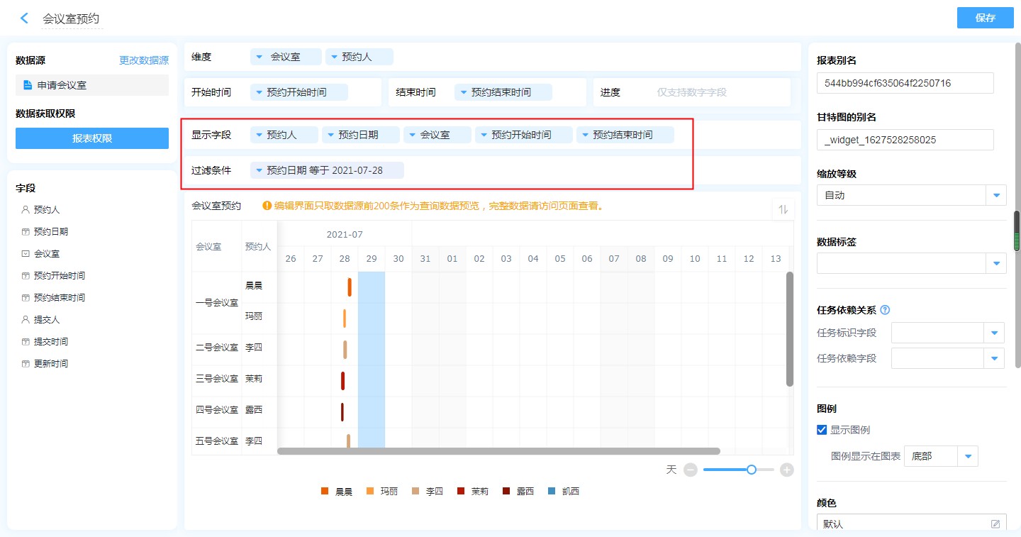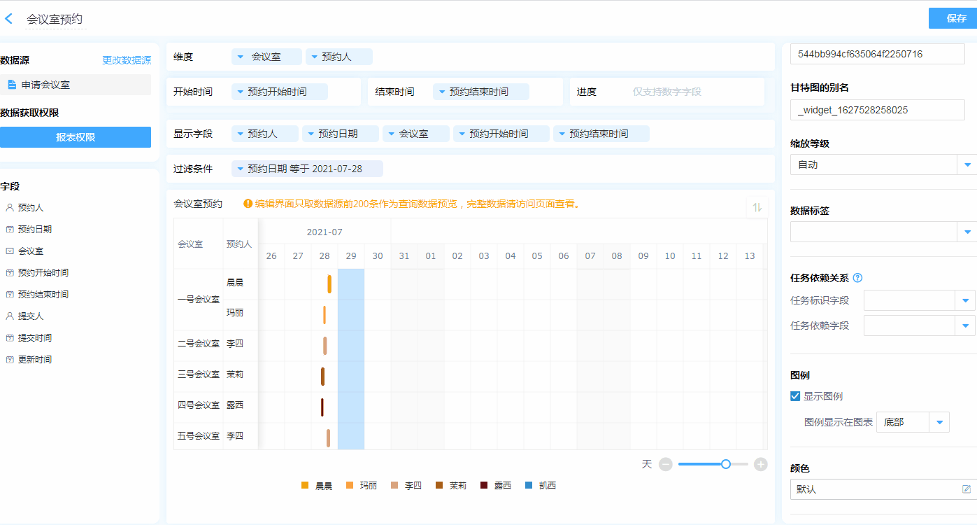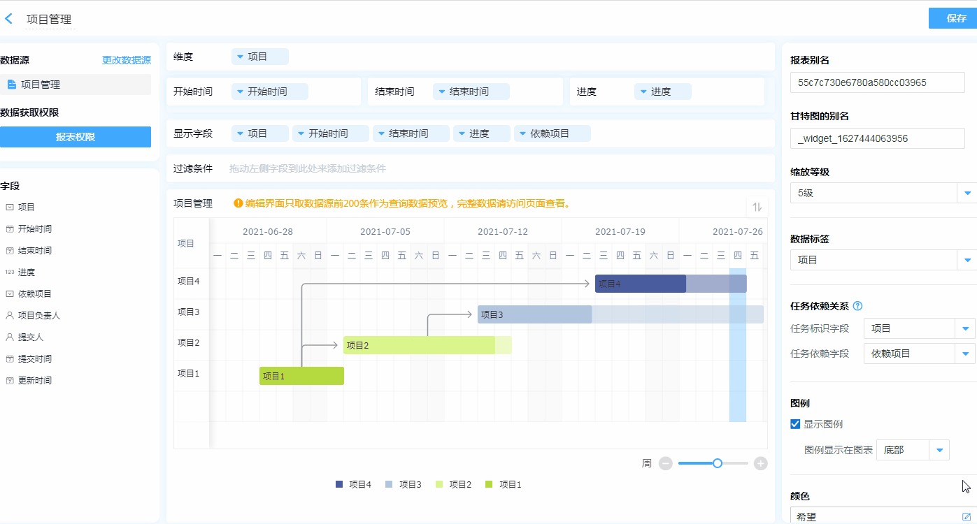 甘特图的设计区分为 维度、开始时间&结束时间、进度、显示字段、过滤条件以及数据显示区。