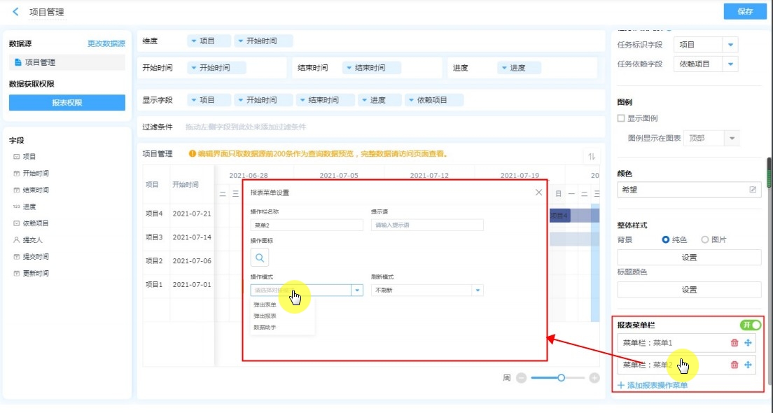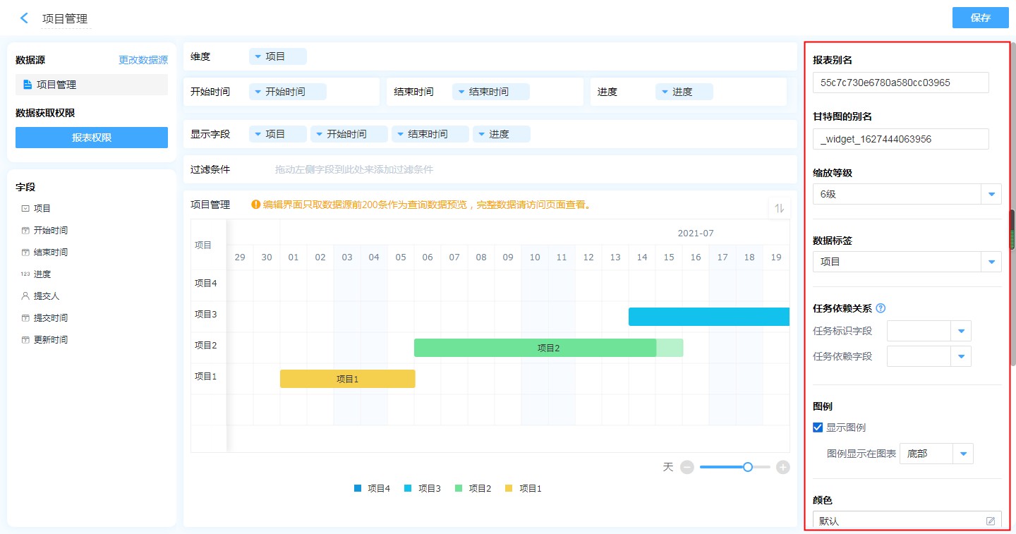 • 如果维度添加了子表单字段,那么开始时间、结束时间、进度中只能添加同一子表单中的字段,即维度、开始时间、结束时间、进度只能设置同一子表单字段。