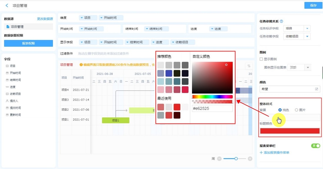 支持自定义图表的配色,优化各个数据的展示。可选择现有的配色方案,或者自定义每项的颜色。