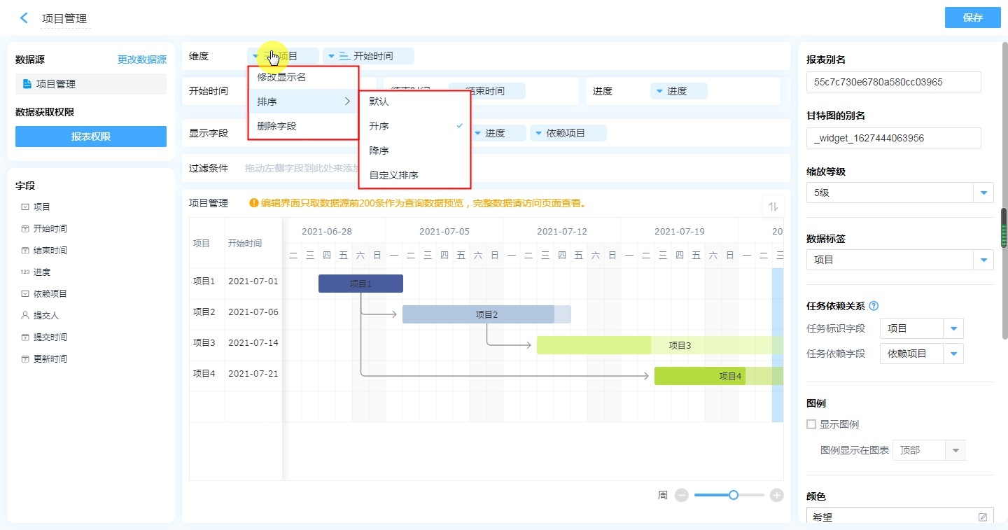 • 排序:支持按照指定的格式(升序、降序、自定义排序)对甘特图内的数据进行排序。