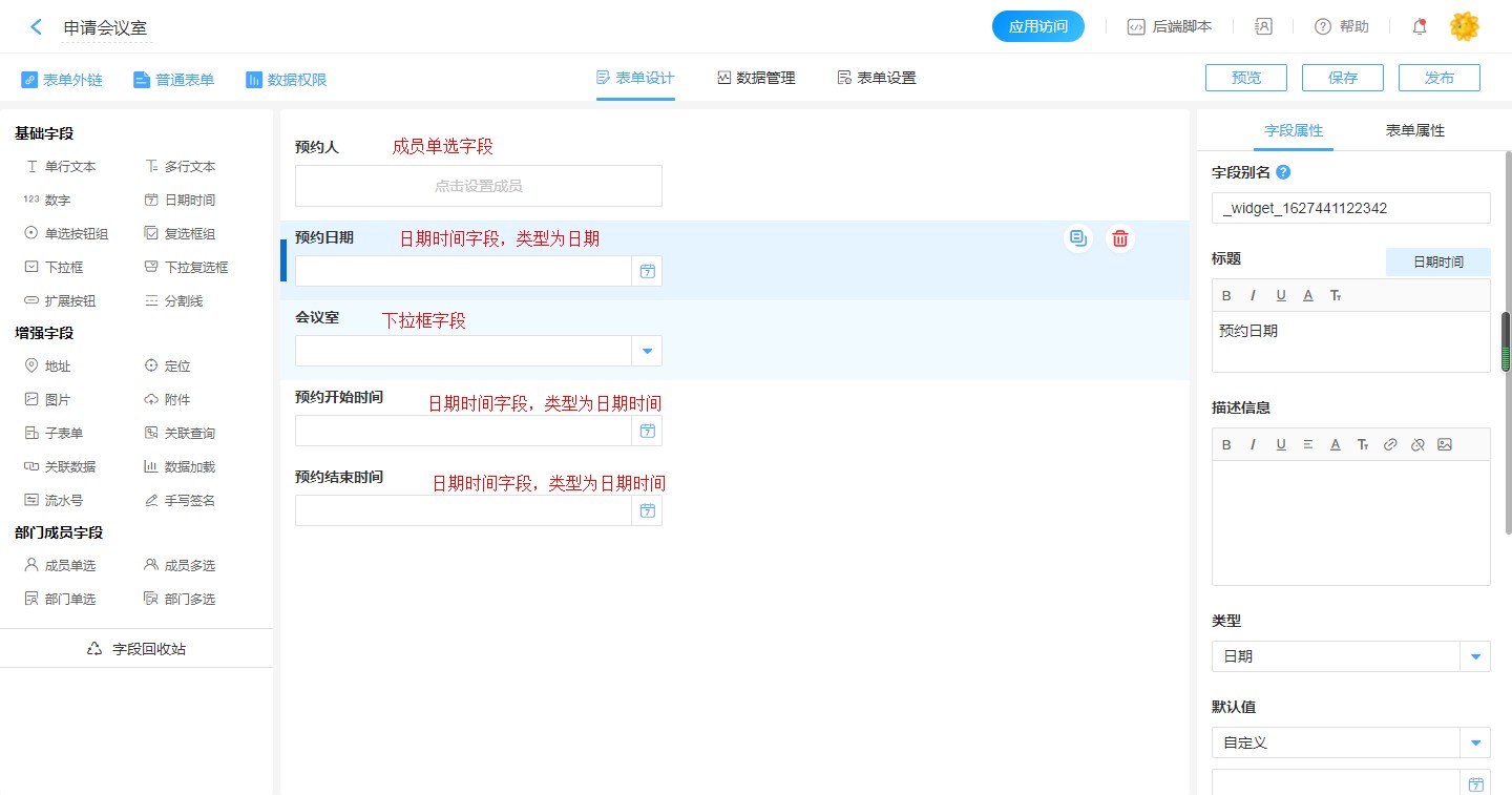 设计如图所示的会议室预约表单,发布给成员进行会议室预约。