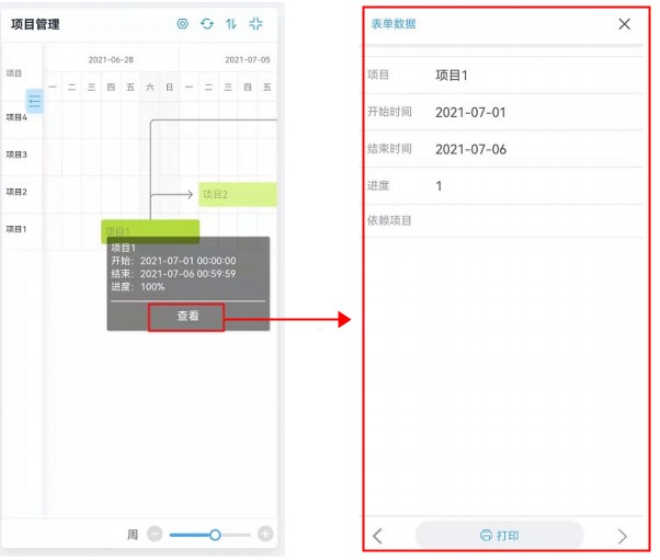 • 点击任务会弹出数据详情页,此时数据详情页只有显示字段和打印功能,不受权限组影响,报表预览界面规则也是如此。