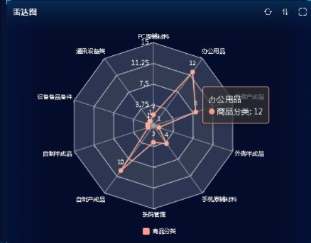 雷达图适合将数据进行多维度展示的情况,如:进销存系统中,商品分析报表中就利用雷达图的多维度展示能力,将所有商品的具体销售情况进行多维度的对比。