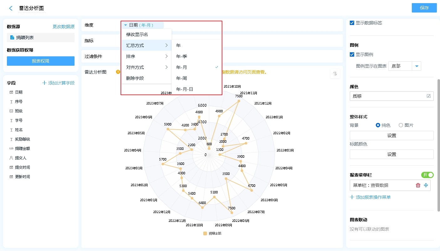 • 汇总方式: 仅日期时间字段可设置,可以设置按照何种日期格式对数据进行汇总(如:按年、按季度、按月汇总)