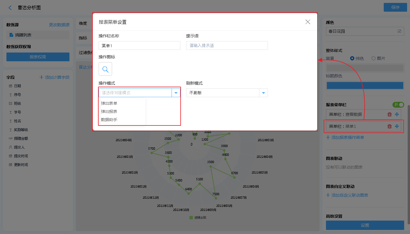 报表菜单 支持 弹出表单、弹出报表、数据助手