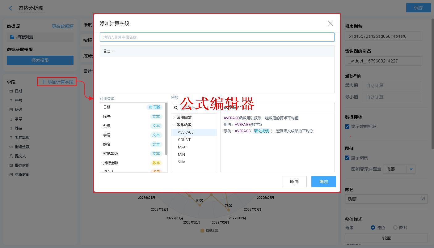 也可以通过增加公式字段,对报表中显示的内容进行简单的计算处理【支持绝大多数数学函数及+-*/四则运算】。