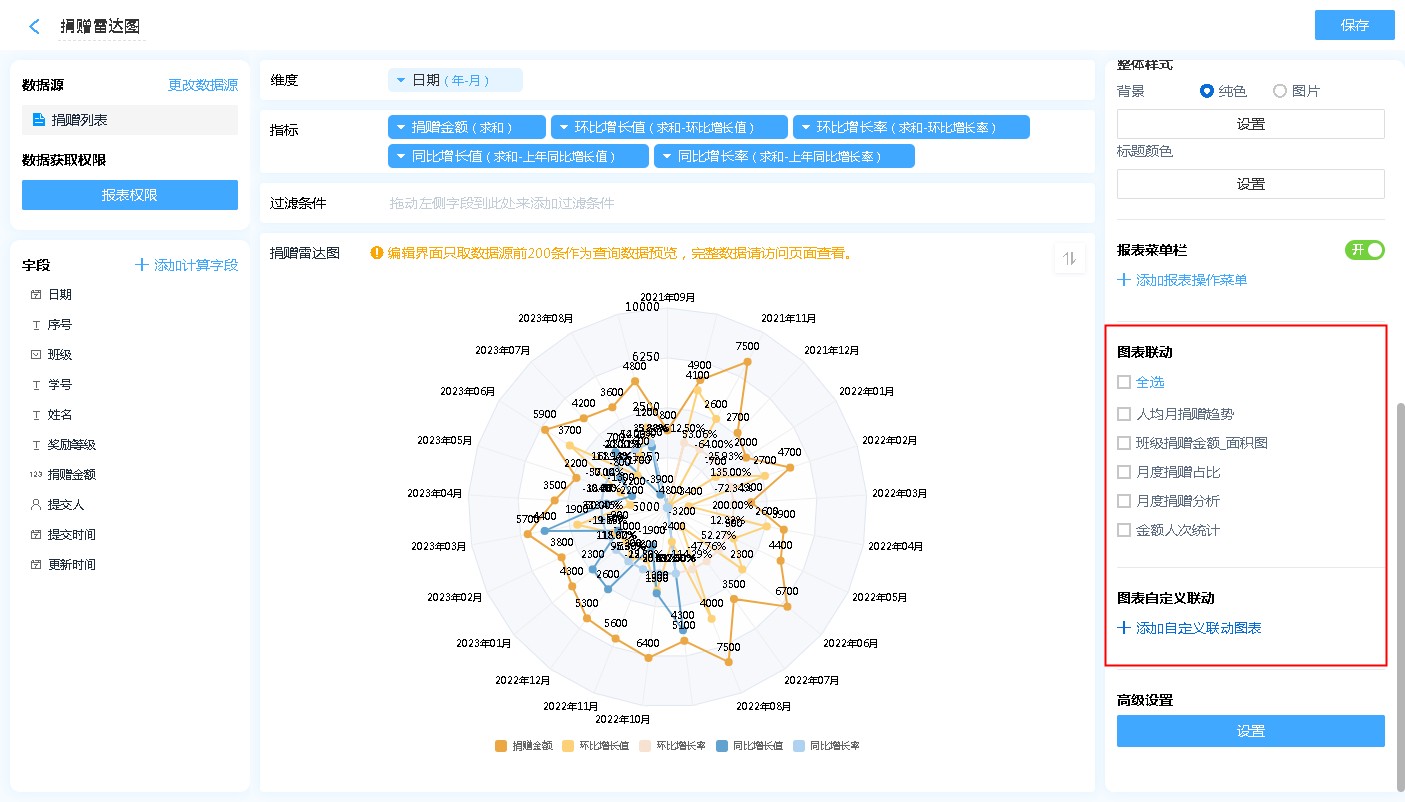 雷达图支持和其他表单联动,联动目标支持同数据源的任何报表。主联动表中选择某个字段或某个数据,被联动表中会出现与之相应的数据。