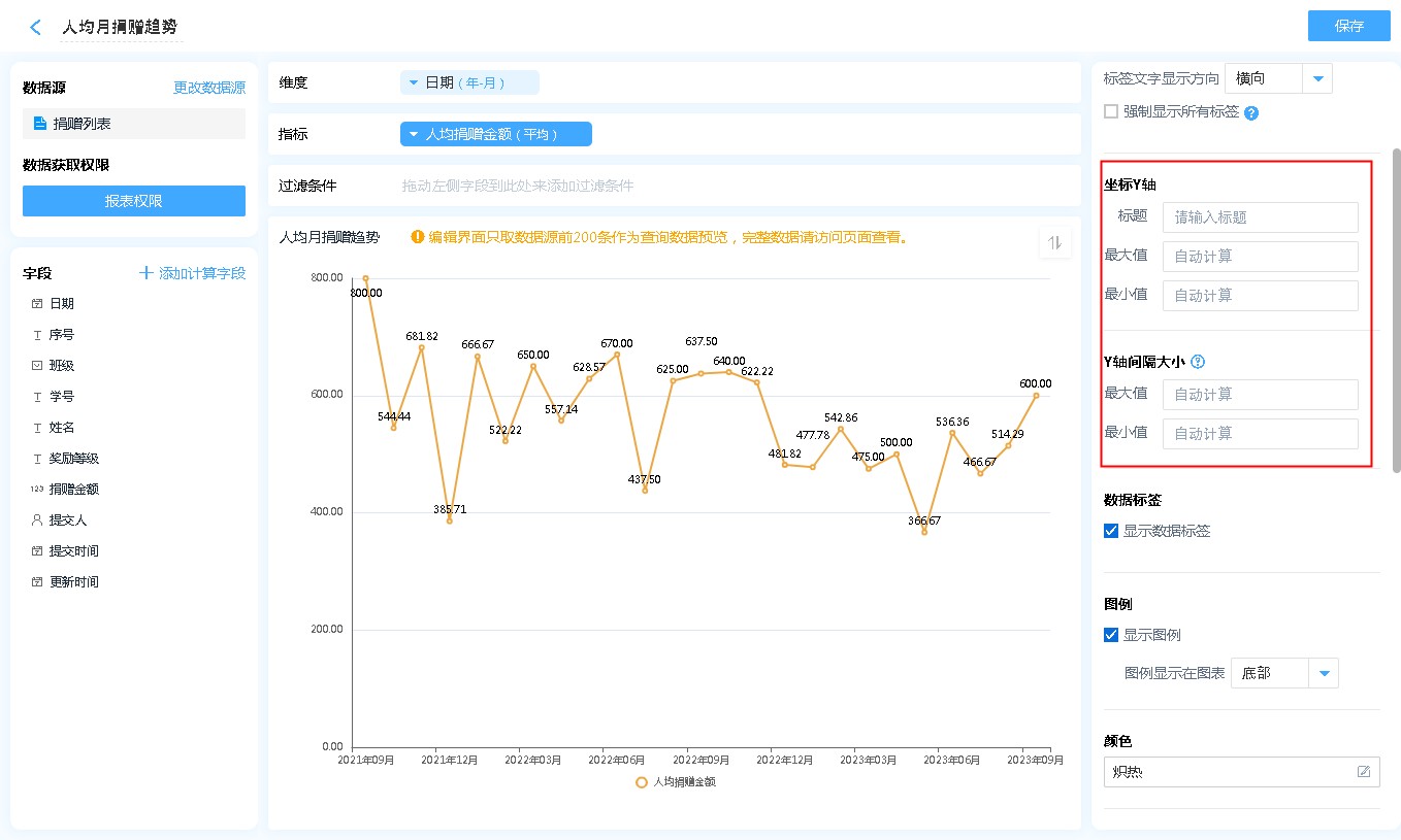 • 当Y轴刻度过多时,会自动隐藏掉部分刻度的坐标值,这样报表展示会更美观。
