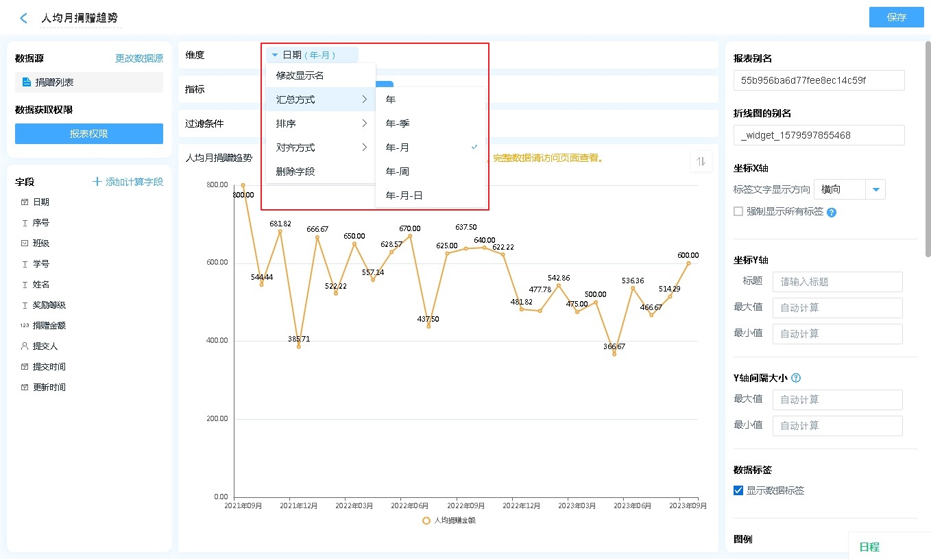 • 汇总方式: 仅日期时间字段可设置,可以设置按照何种日期格式对数据进行汇总(如:按年、按季度、按月汇总)