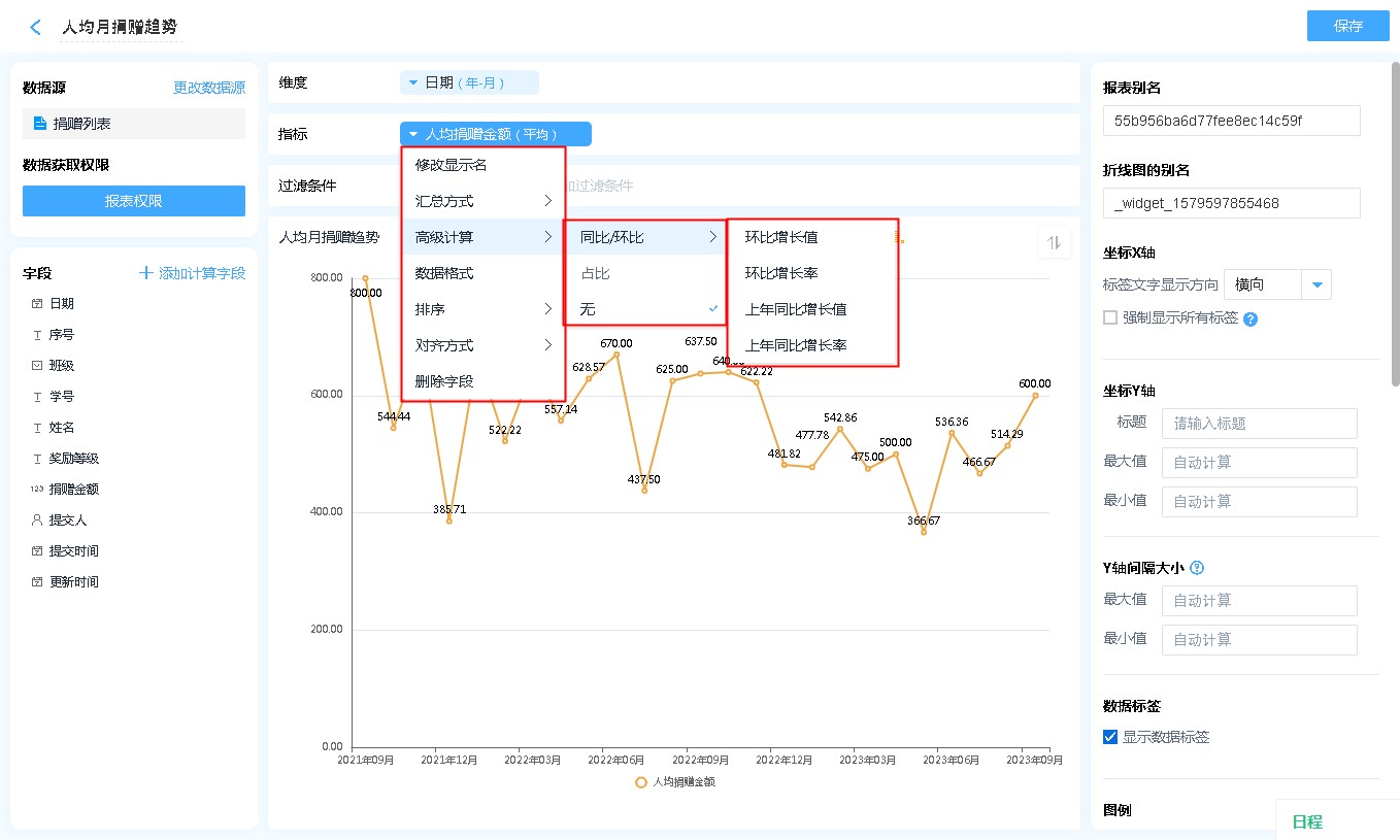 • 显示名称: 字段添加进入显示字段区域后,可自行修改其在折线图中的表头文字