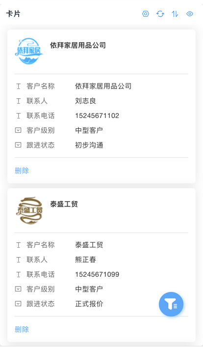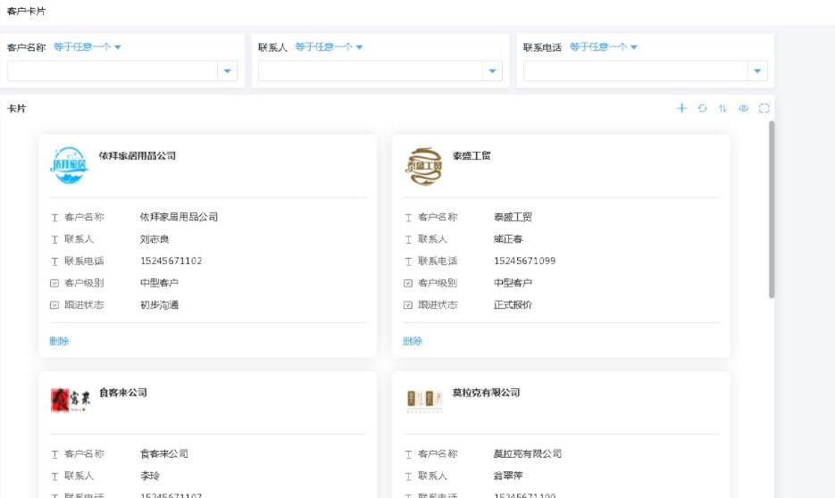 卡片报表尤其适合移动端快速查看自己所关心的内容,配合菜单的使用可以更加方便的操作自定义菜单,如:场景卡片中,客户卡片报表中就利用场景卡片报表的功能,像名片一样展示客户的信息,方便信息的查看和维护。