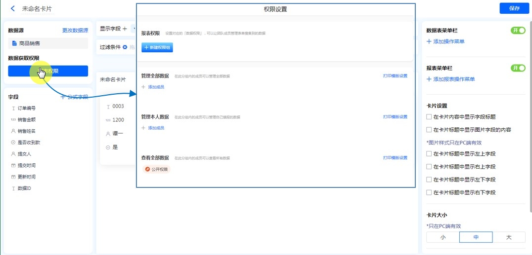 卡片场景报表的自定义权限仅可设定自定义菜单权限