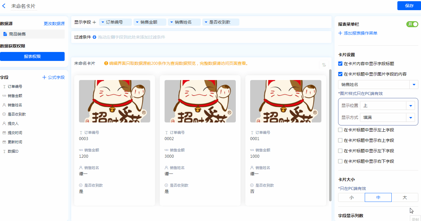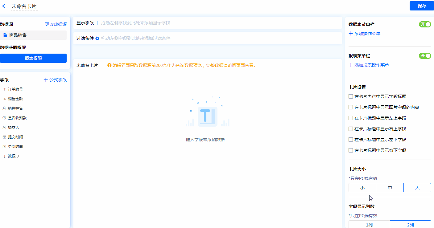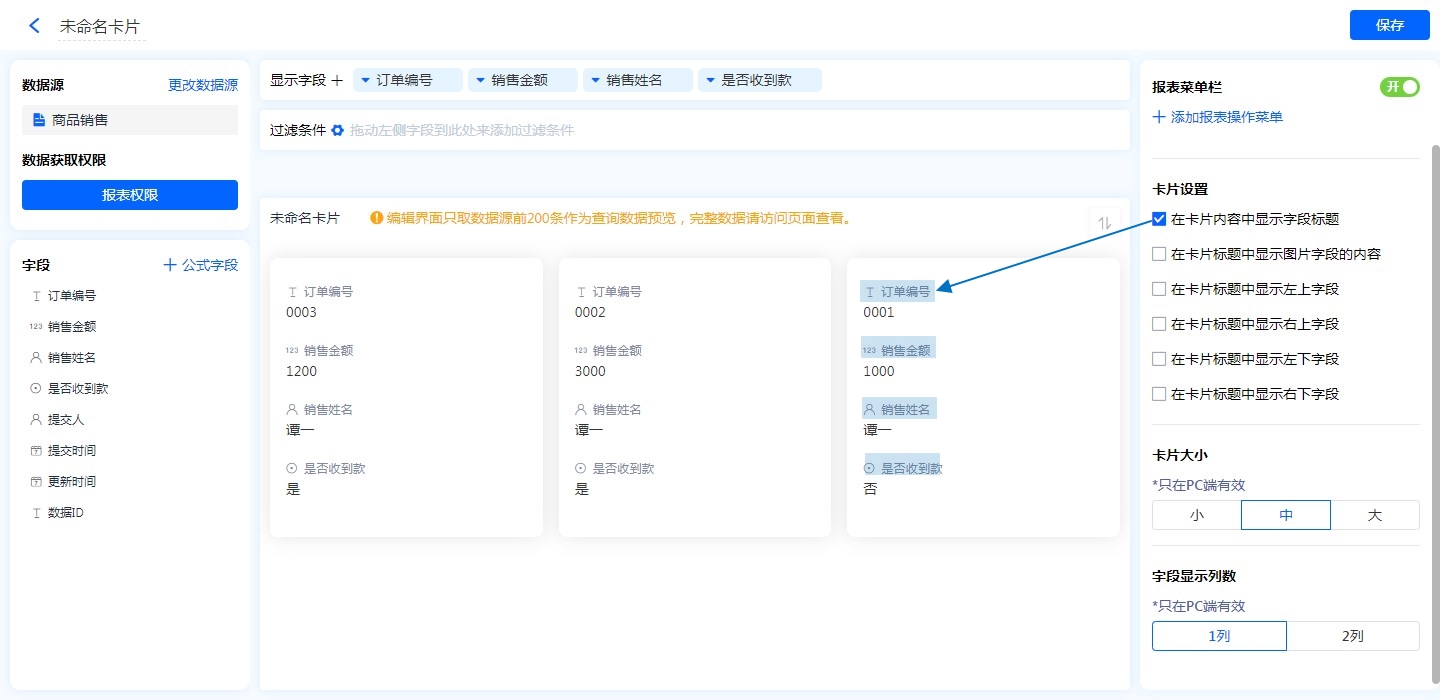 当卡片大小设置中/大时,可以设置字段显示列数。