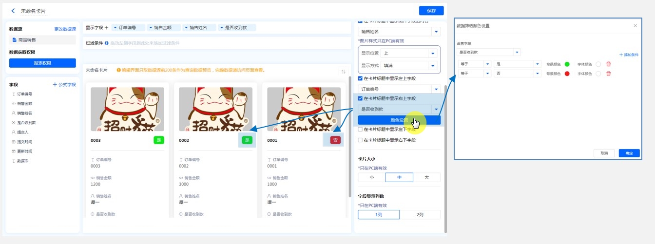 卡片右上字段支持设置颜色,对数据筛选的颜色进行设置,高亮显示符合条件的数据。