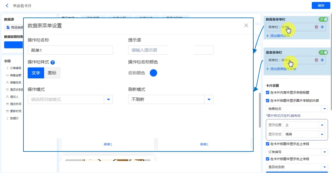 数据表菜单栏 支持 弹出表单、弹出报表、数据助手、功能插件
