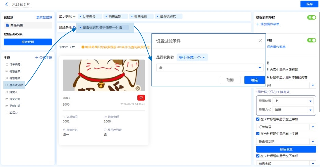 可以将卡片场景报表中显示的数据,通过对过滤条件进行设置,只显示符合条件的数据,详情参考过滤条件。